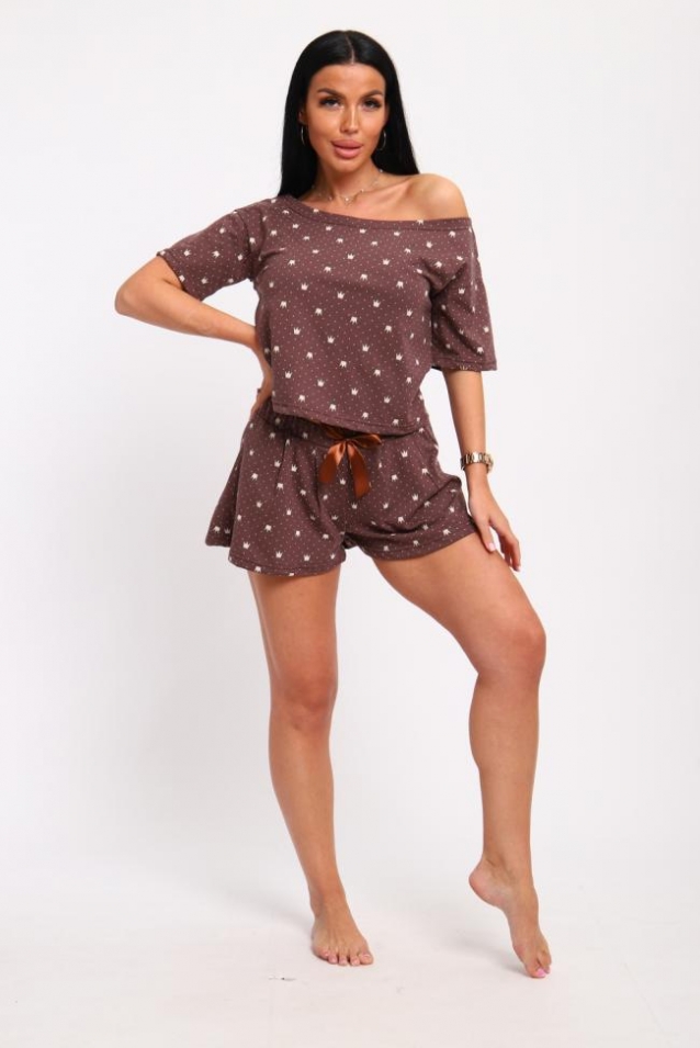 Пижама женская футболка и шорты. Футболка свободного кроя, широкий вырез горловины. Рукав короткий на спущенном плече.