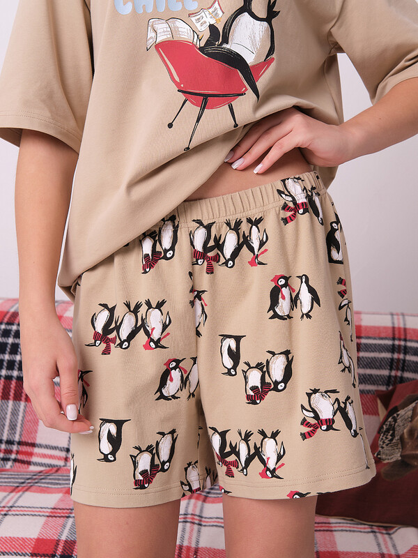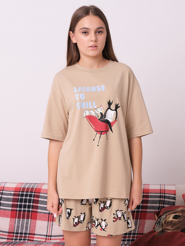Состав: верх: 95%хлопок 5%эластан, низ: 95%хлопок 5%эластан Пижама женская с шортами. В составе ткани преобладает высококачественный хлопок — домашняя пижама мягкая, гипоаллергенная и хорошо пропускает воздух. В пижаме вам будет комфортно и уютно во время сна. Эластан помогает модели надолго сохранить первоначальную форму. Футболка свободная, плечо спущено, рукава широкие — в пижаме очень удобно спать. В поясе шорт мягкая и широкая резинка — не перекручивается и не давит. Отделка горловины из эластичной рибаны — она не растягивается, пижаму удобно надевать и снимать. Костюм домашний женский украшен прикольным принтом, надпись переводится: «лецензия на чилл» — поймайте позитивное настроение! Домашний комплект с шортами неприхотлив в уходе. Принты эластичные и прочные, без проблем переносит частые стирки. Помните о правильном уходе за изделием: рекомендуется стирать при температуре не выше 30 °C, без предварительного замачивания, с изнанки. Это поможет сохранить качество и цвет пижамы на длительное время. Не забывайте о выборе правильного размера. Используйте таблицу размеров на фотографии, чтобы выбрать подходящий для себя вариант. Обратите внимание, что цвет товара на экране вашего устройства может отличаться от реального. Комментарии к товару