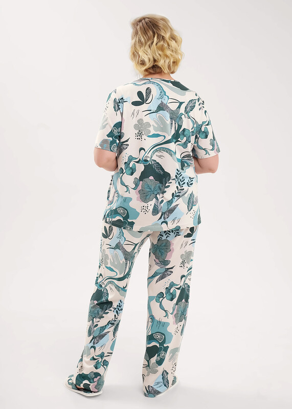 Пижама из трикотажного полотна с модалом. Джемпер по горловине и борту обтачка с застежкой на пуговицы, накладные карманы, нашивка металл. Короткий втачной рукав. Боковые разрезы. Брюки с поясом на внутренней резинке. Боковые карманы с отрезным бочком.