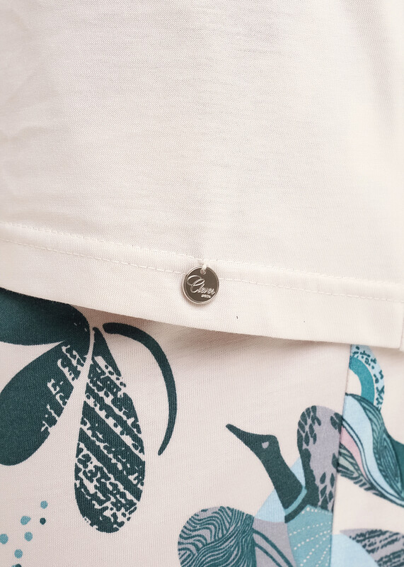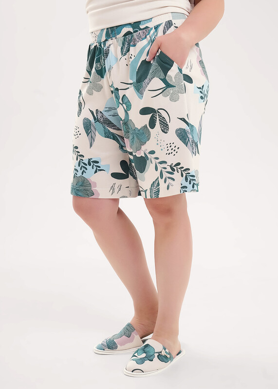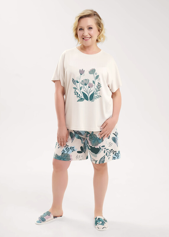 Пижама для дома и отдыха из трикотажного полотна с добавление модала.Футболка прямого кроя, короткий цельнокроенный рукав.Округлая горловина с обтачкой. Спереди принт,нашивка металл. Шорты с поясом на внутренней резинке.Боковые карманы с отрезным бочком.