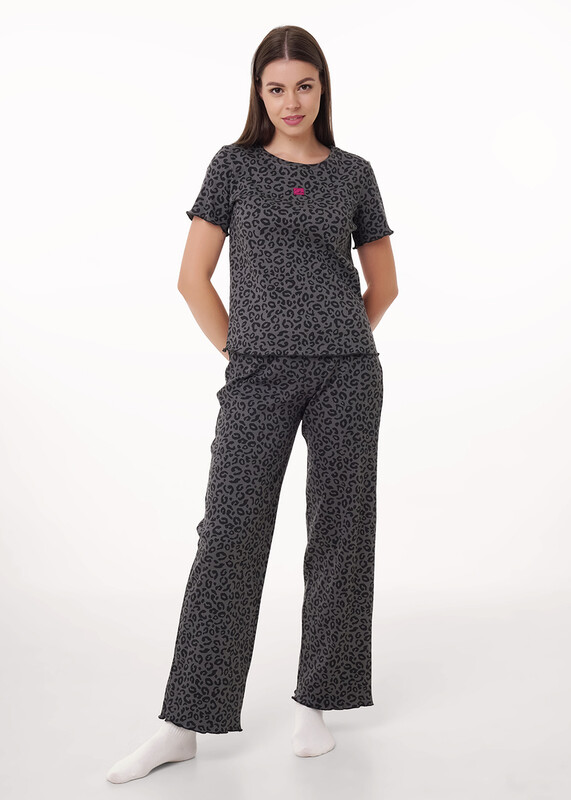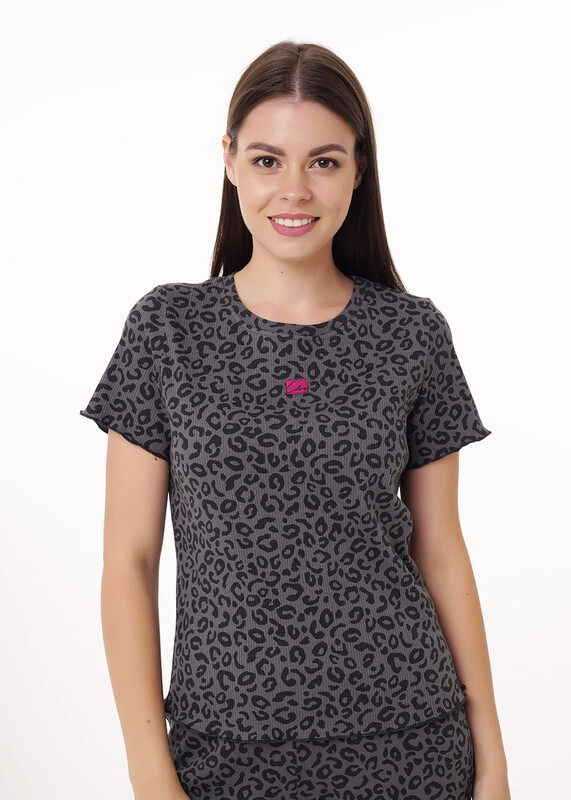 Пижама для дома и отдыха из трикотажного полотна с эластаном кашкорсе. Футболка прямого кроя, короткий втачной рукав, округлая горловина с обтачкой, спереди нашивка. Брюки прямые с внутренней резинкой. По низу футболки, рукавов и брюк мелкий оверлок.