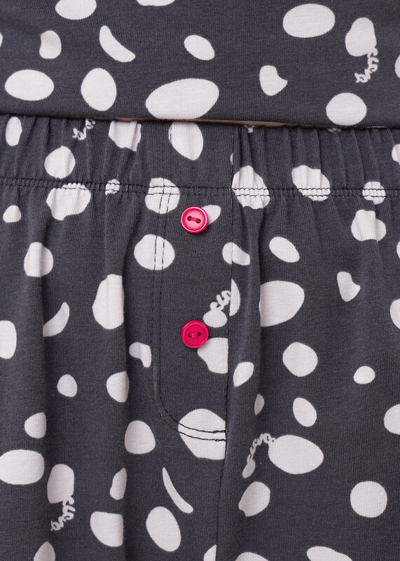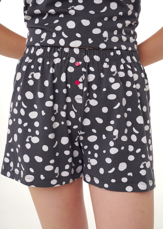 Пижама для дома из хлопкового трикотажного полотна с эластаном.Майка прямого силуэта, среднее плечо.По горловине и пройме окантовка с застилом, внизу нашивка.Короткие шорты с притачным поясом на внутренней резинке,спереди имитация гульфика с пуговицами.