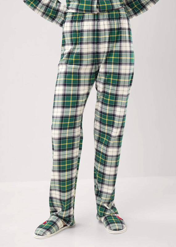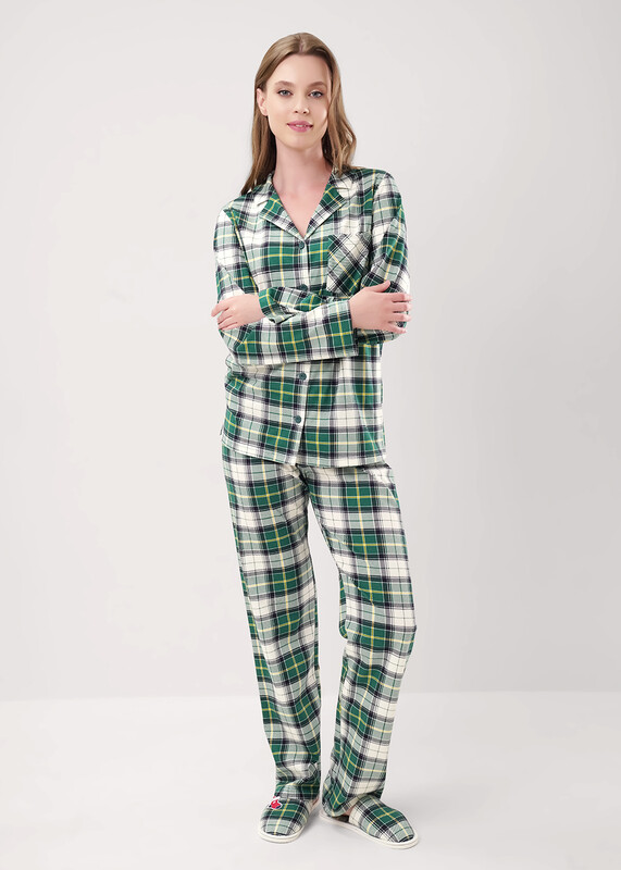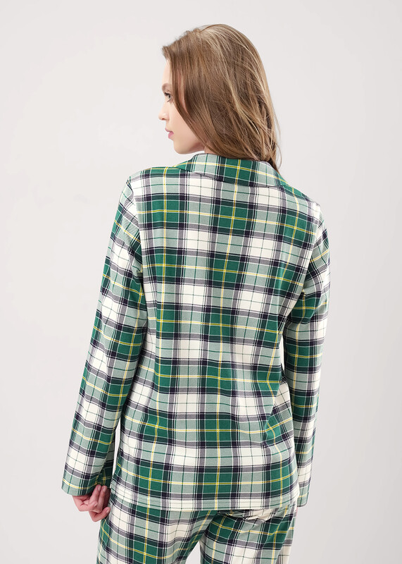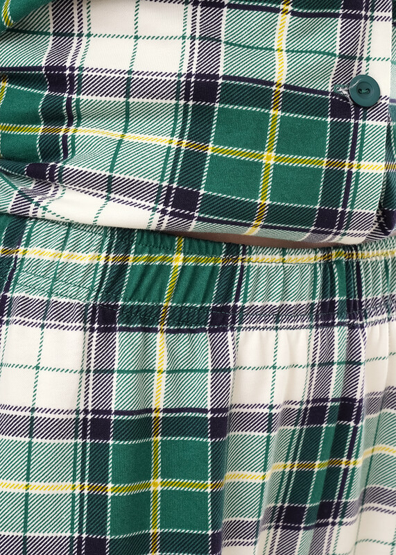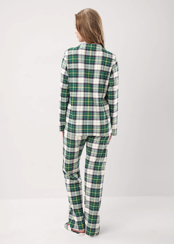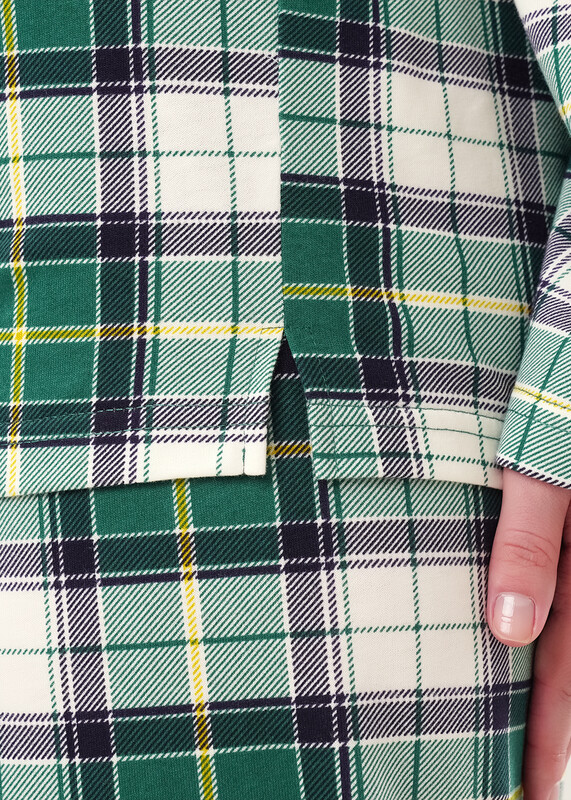 Пижама для дома из хлопкового трикотажного полотна с карбоном. Джемпер с длинным втачным рукавом. Застёжка на пуговицы, воротник с лацканами. По переду накладной карман, нашивка. Боковые разрезы. Брюки прямые, цельнокроенный пояс на внутренней резинке.