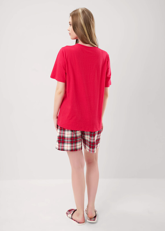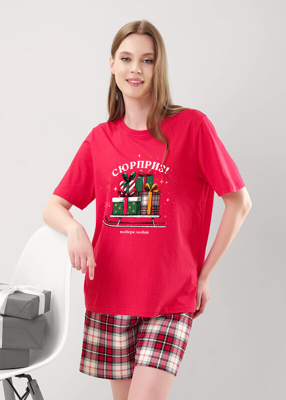 Пижама из хлопкового трикотажного полотна. Футболка прямого кроя. Короткий втачной рукав. Округлая горловина с обтачкой. Спереди принт. В боковом шве вшивка. Шорты из трикотажного полотна с карбоном прямые, пояс на внутренней резинке с киперной лентой.