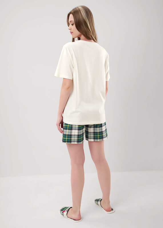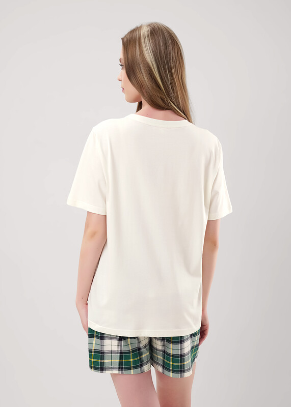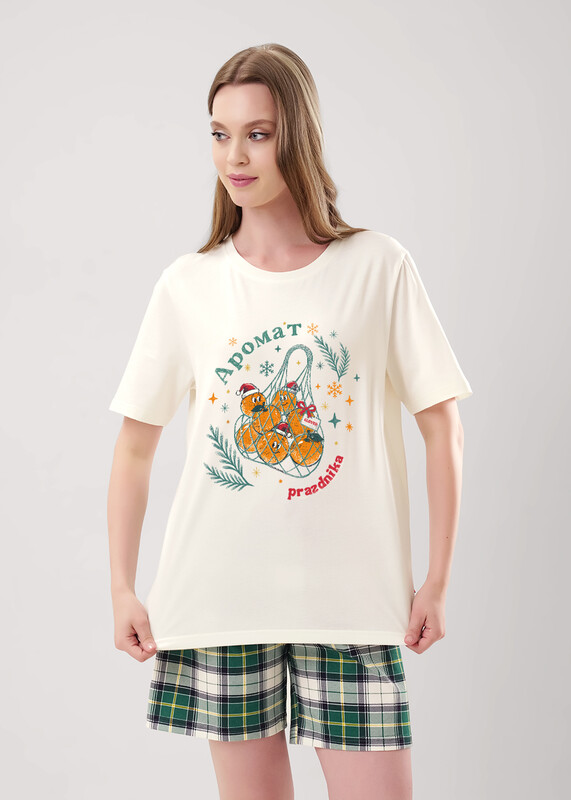 Пижама из хлопкового трикотажного полотна. Футболка прямого кроя. Короткий втачной рукав. Округлая горловина с обтачкой. Спереди принт. В боковом шве вшивка. Шорты из трикотажного полотна с карбоном прямые, пояс на внутренней резинке с киперной лентой.