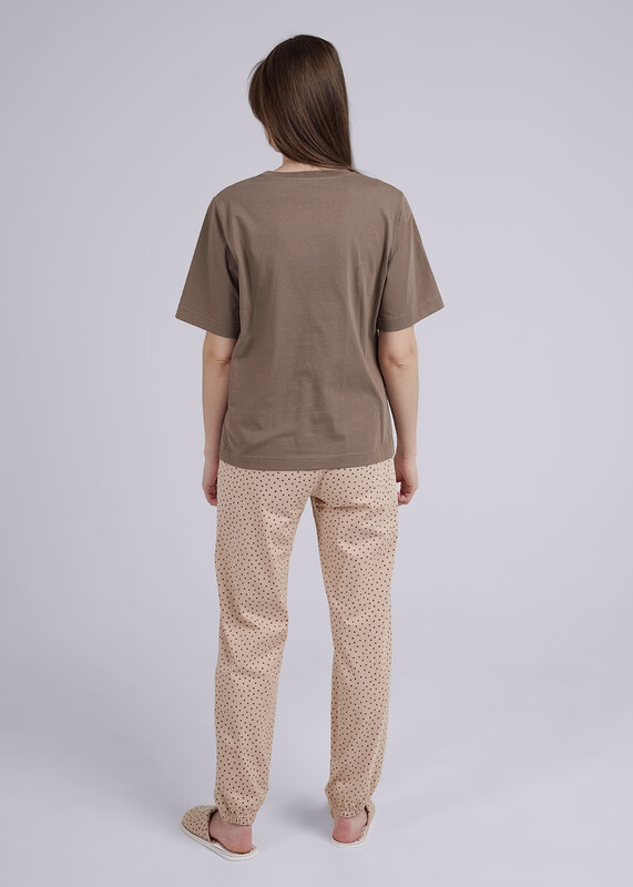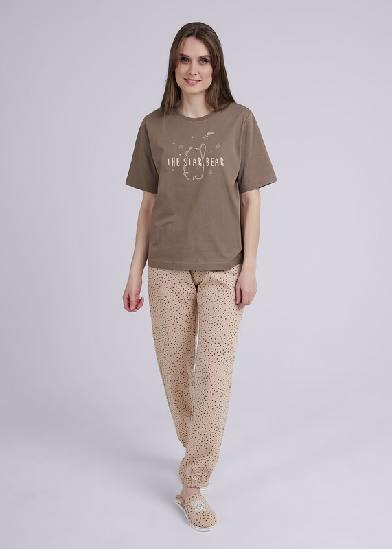 Комплект из футболки и брюк. Футболка из однотонного трикотажа, прямого силуэта с втачным рукавом, на переде принт. Брюки из набивного трикотажа с боковыми карманами с отреным бочком, по низу брюк манжеты на резинках, пояс на резинке со шнуром.