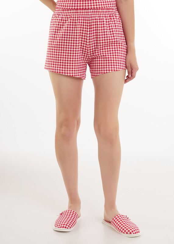 Пижама из хлопкового трикотажного полотна. Майка на узких бретелях. По горловине и пройме окантовка. По переду нефункциональная планка с пуговицами, вырез горловины декорирован кружевом. На спинке принт. Шорты укороченные с поясом на внутренней резинке.