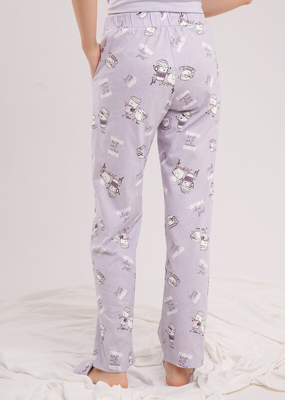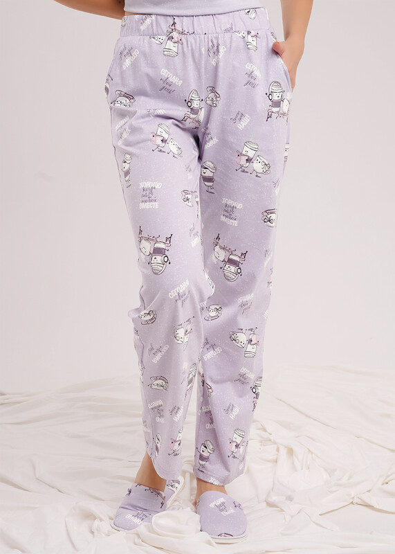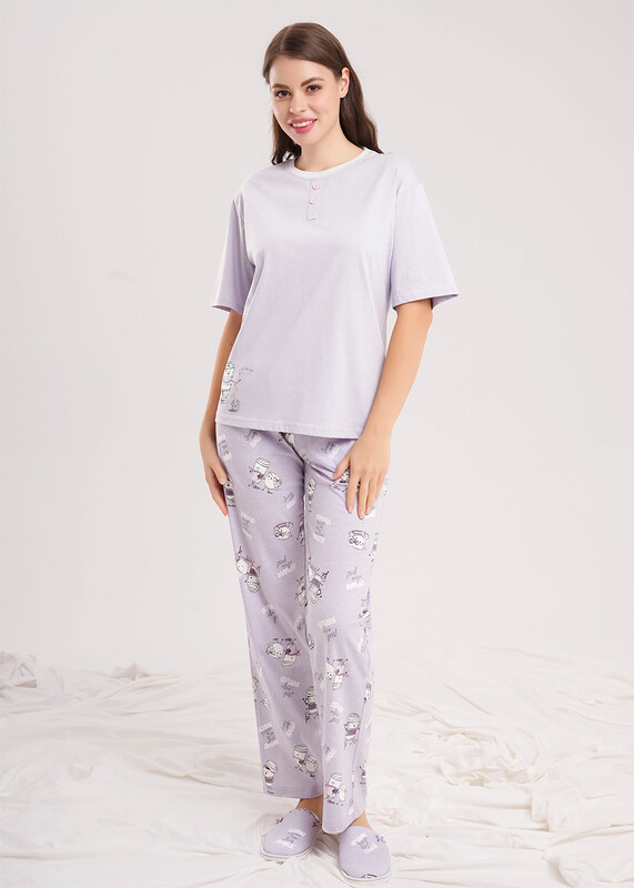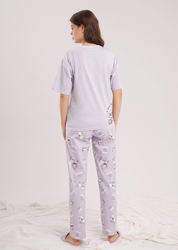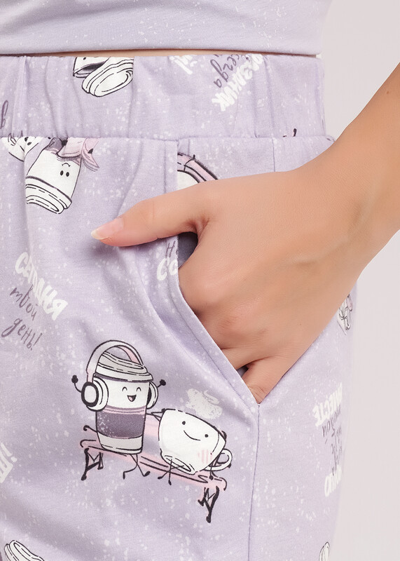 Набор одежды из трикотажного полотна.Футболка прямого кроя.Короткий спущенный рукав.Горловина с обтачкой и планкой на пуговицы.Спереди и сзади принт,нашивка бант.По низу рукава и изделия застилы.Брюки с поясом на резинке.Боковые карманы с отрезным бочком