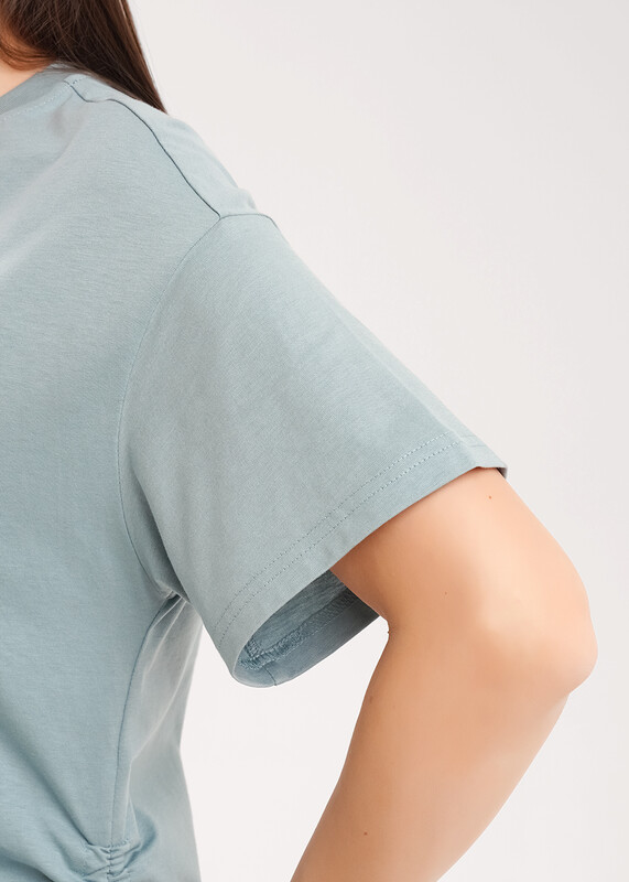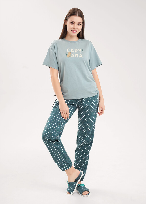 Набор одежды из трикотажного полотна.Футболка прямого кроя, короткий втачной рукав,вышивка.Горловина с обтачкой. Спереди принт,по бокам кулиса с завязками из окантовки.Брюки с поясом на внутренней резинке.Боковые карманы с отрезным бочком,по низу резинка