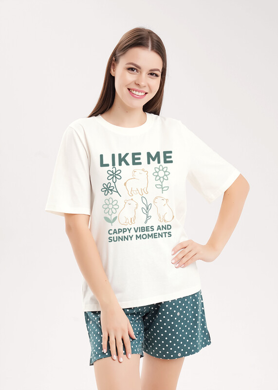 Набор одежды для дома и отдыха из хлопкового трикотажного полотна. Футболка прямого кроя, короткий втачной рукав, округлая горловина с обтачкой. Спереди принт. Короткие шорты свободного кроя, цельнокроеный пояс на внутренней резинке. Боковые разрезы.