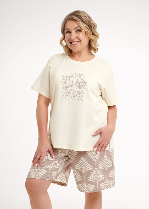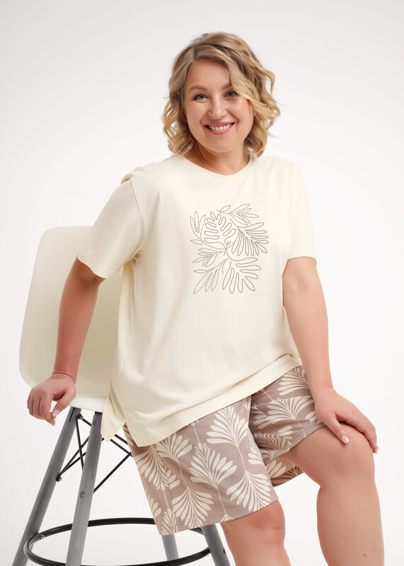 Набор одежды из хлопкового трикотажного полотна. Футболка прямого кроя. Округлая горловина с обтачкой, короткий втачной рукав. Боковые разрезы. Спереди принт вспенка. Шорты свободного кроя, пояс на внутренней резинке. Боковые карманы с отрезным бочком.