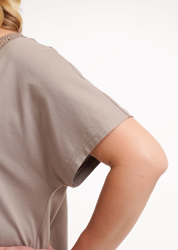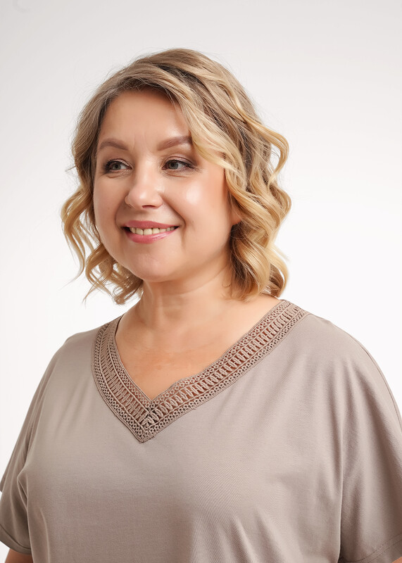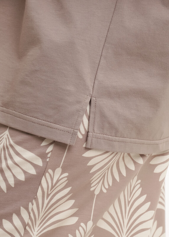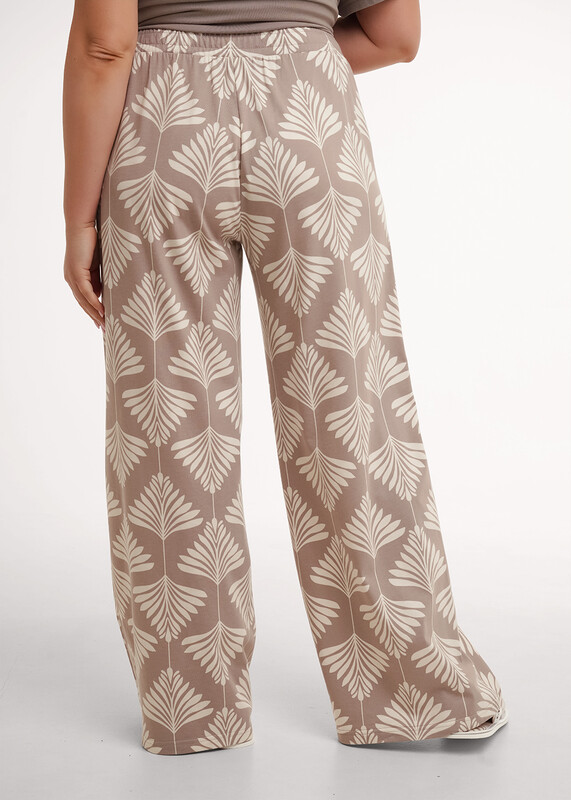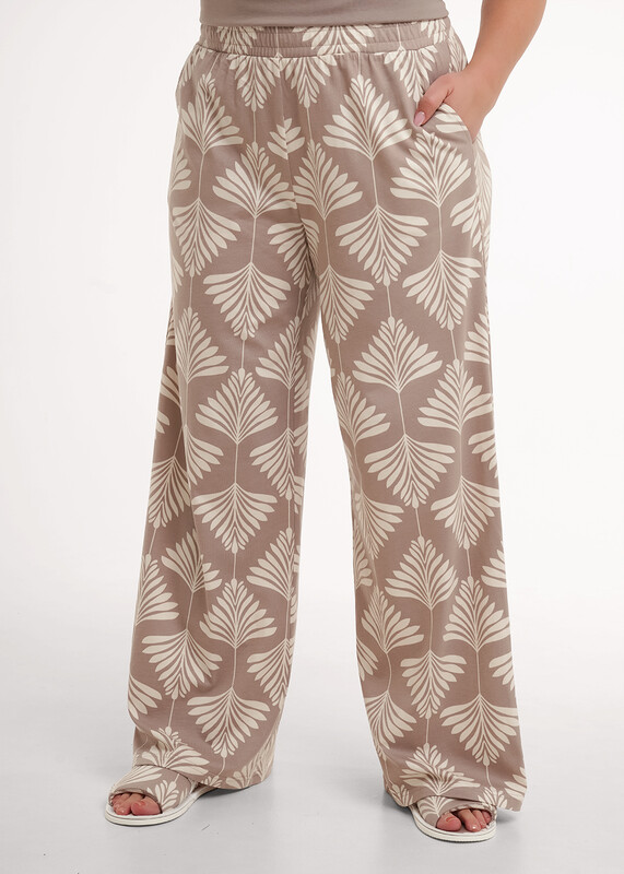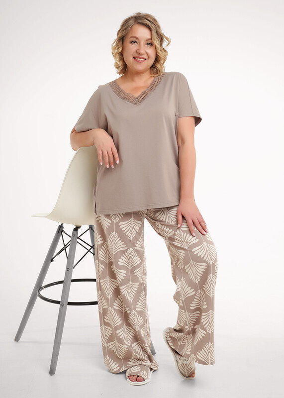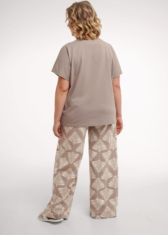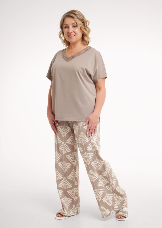 Набор одежды из трикотажного полотна. Джемпер прямого кроя, короткий цельнокроенный рукав. V-образная горловина, по горловине переда кружево. Боковые разрезы, принт вспенка. Брюки прямые с поясом на внутренней резинке. Боковые карманы с отрезным бочком.