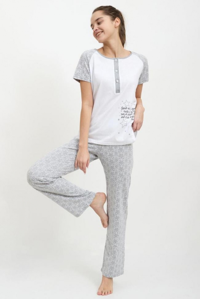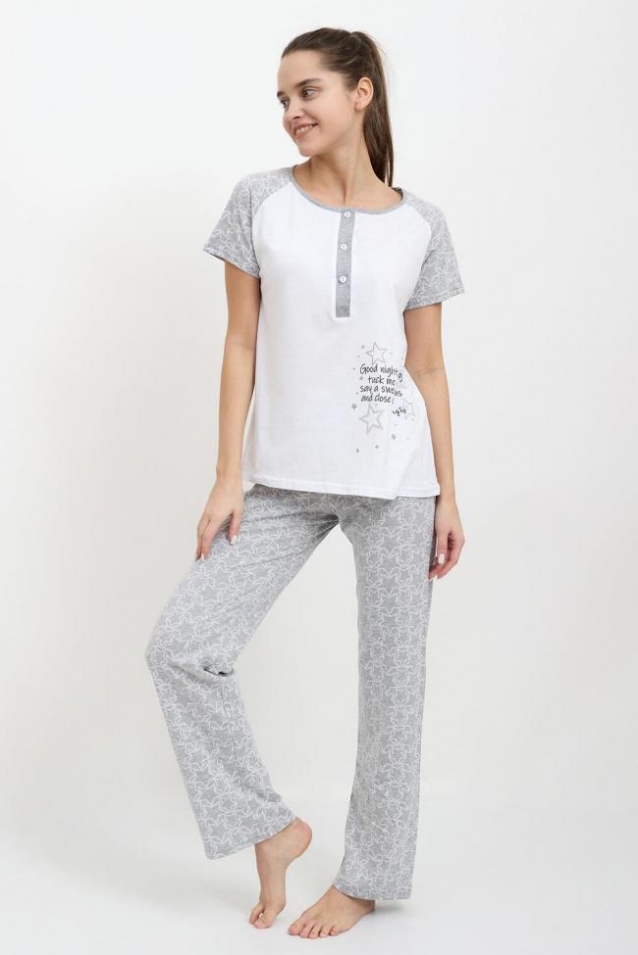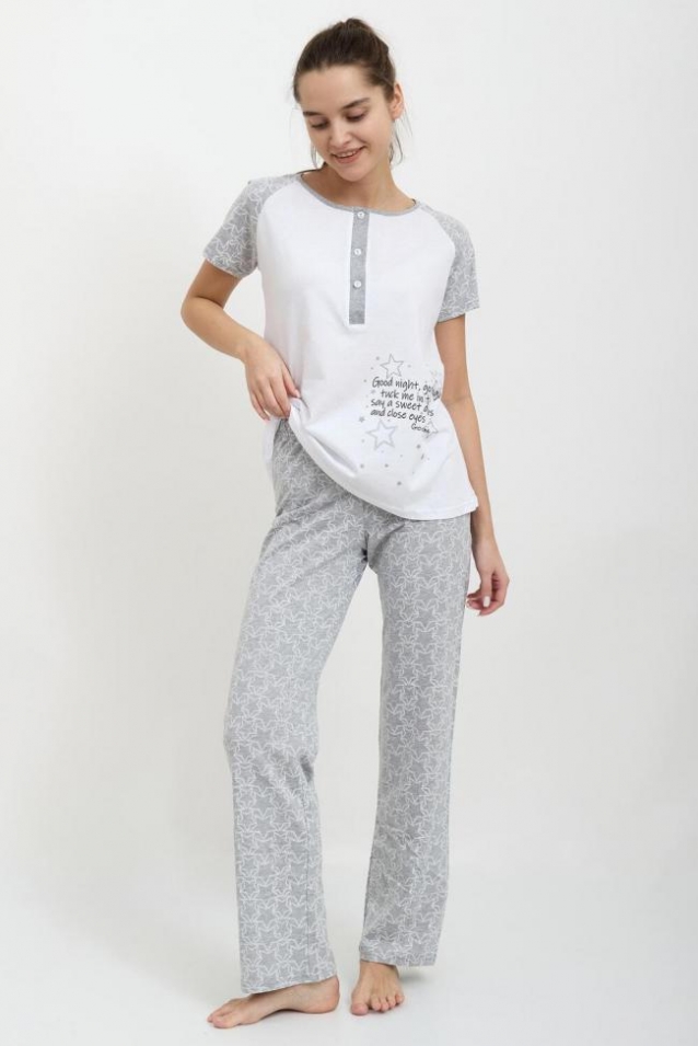 Женская пижама из качественной кулирки. В комплекте футболка прямого кроя и длинные брюки. Футболка комбинирована: полочка из белой ткани с принтом, а спинка из ткани с рисунком. Рукав реглан короткий. Круглый вырез горловины с функциональными пуговицами по планке. Брюки прямого кроя из ткани с рисунком, оборудованные двумя карманами. Такой комплект подарит вам уют и комфортный сон.
