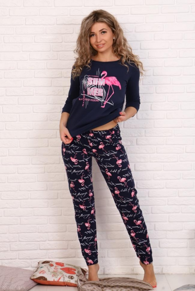 Домашний женский костюм с веселым принтом. Кофта с рукавом 3/4 полуприлегающего кроя с принтом в виде фламинго. Рисунок выполнен с использованием современных технологий. Длинные пижамные штаны с принтом и 2 прорезными карманами и лонгслив. Легкий костюм с брюками выполнен из натурального 100% хлопка, что делает его воздухопроницаемым, гидроскопичным и гипоаллергенным. Ткань кулирка слабо поддается растяжению и усадке. Есть большие и маленькие размеры от 42 до 56. Приятная мягкая к телу ткань, из которой изготовлена женская домашняя пижама не скатывается, сохраняет форму и цвет после множества стирок. Наличие больших размеров в размерной сетке делает комплект прекрасным выбором для беременных и кормящих женщин, а так же как одежда для полных. Эта женская пижама хороша для осенних вечеров в демисезон. Для создания эффекта оверсайз рекомендуем брать на один-два размера больше. Костюм со штанами family look отличный подарок для всех девушек и женщин: маме, подруге, бабушке, сестре, коллеге на любой праздник, особенно в этот демисезонный период! Качественная и удобная домашняя одежда фэмили лук порадует каждого, и будет уместным подарком маме и дочке на любой праздник.