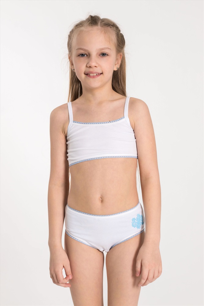 Комплект для девочки топ и трусы выполнен из хлопковой ткани с добавлением лайкры. Топ на тонких бретелях, плотно облегает фигуру, обеспечивая свободу движений благодаря эластичности ткани. По низу изделия резинка. Трусы с высокой талией, пояс на резине. Спереди нанесён принт.
