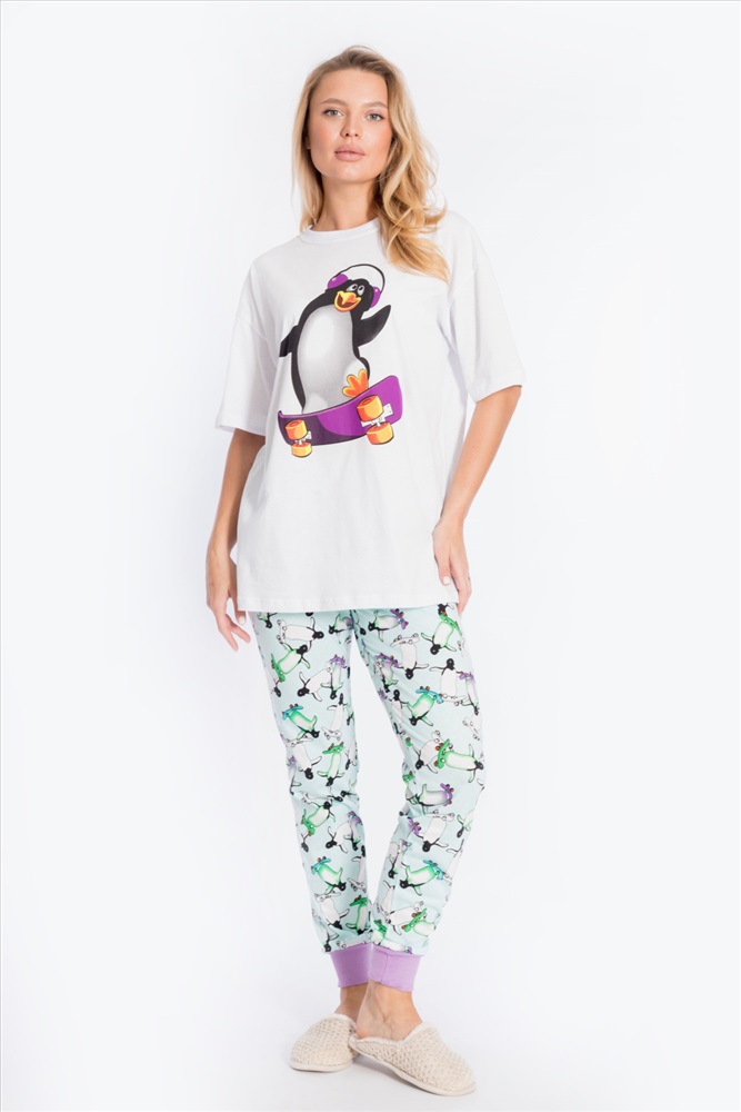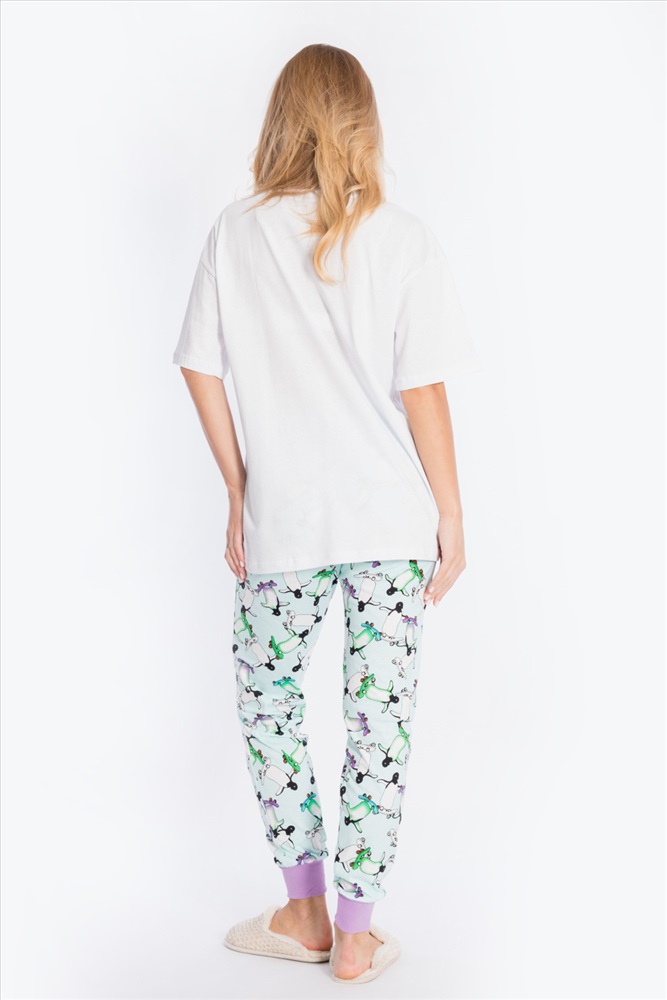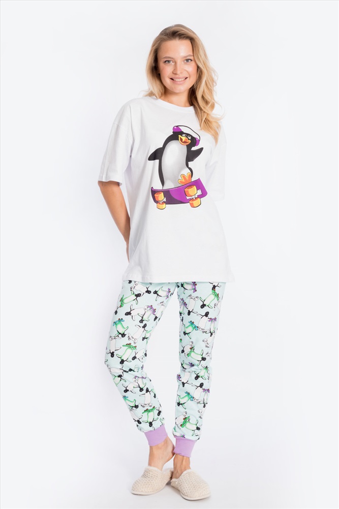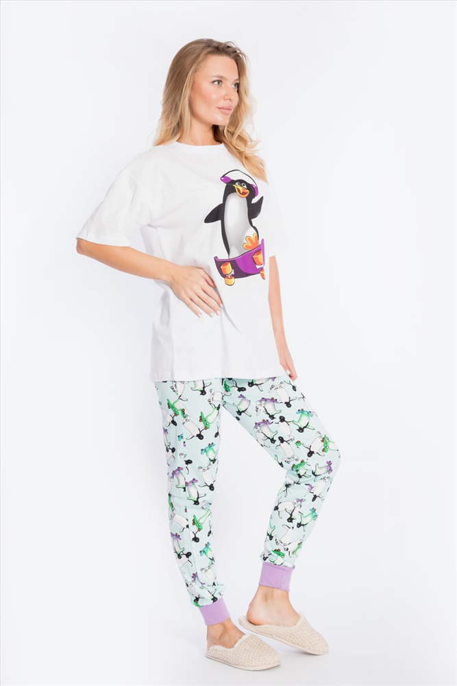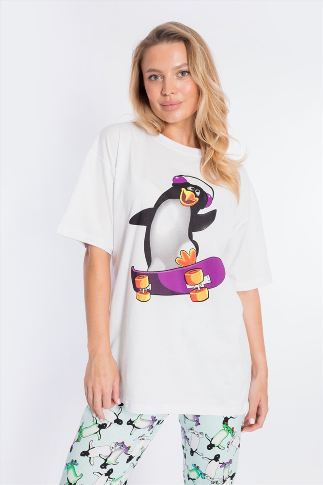 Костюм из кулирки, 100% хлопок, состоит из брюк и футболки. Брюки из кулирки с набивным рисунком, с поясом на резине и манжетами из рибаны. Футболка оверсайз из однотонного полотна, с коротким рукавом и принтом спереди.