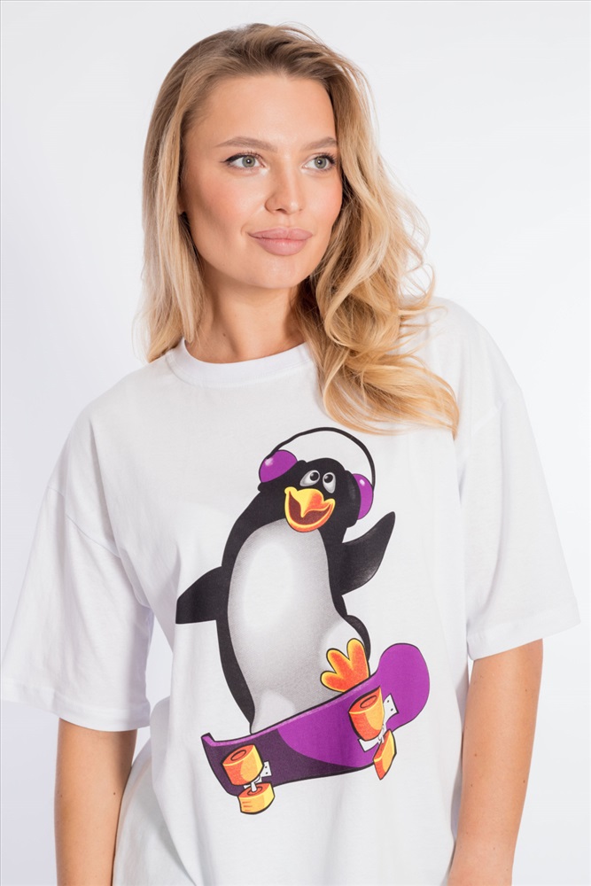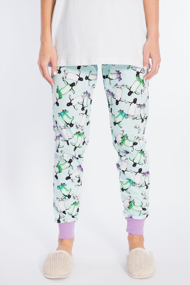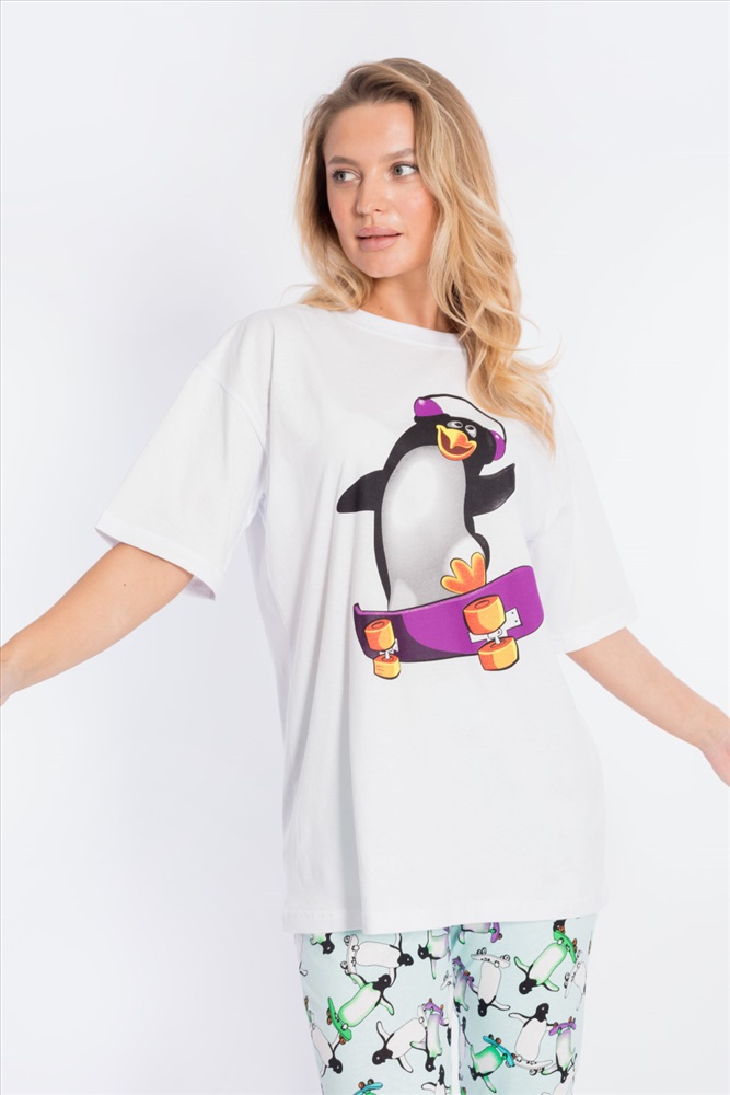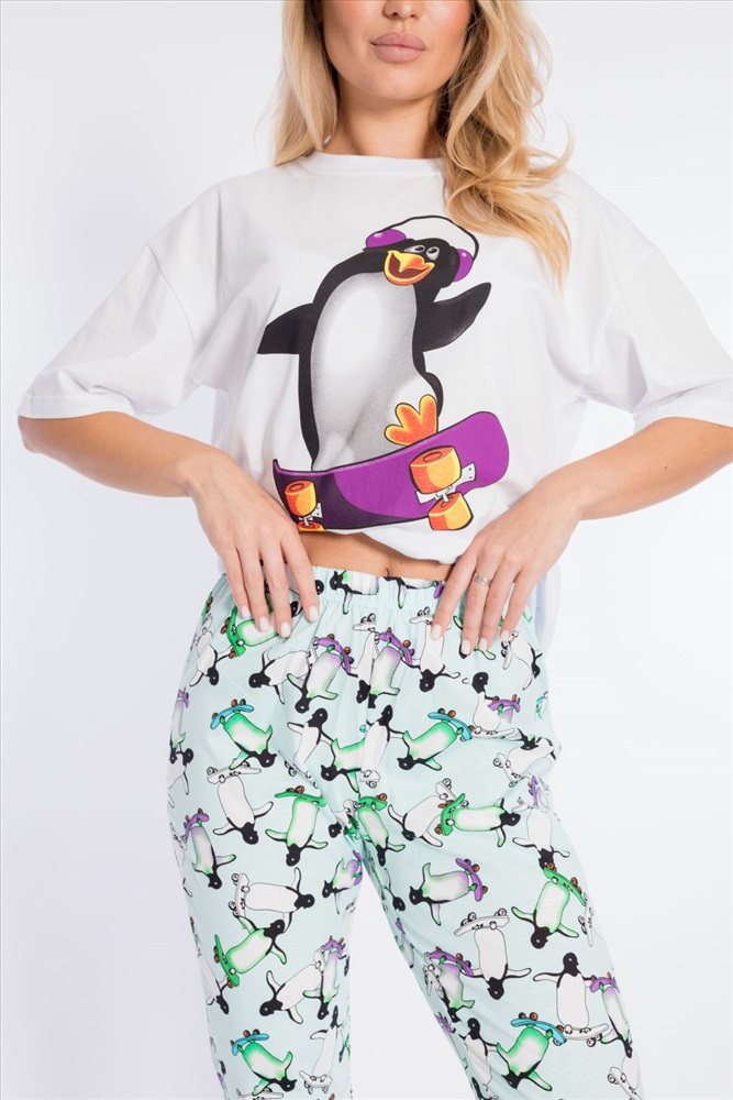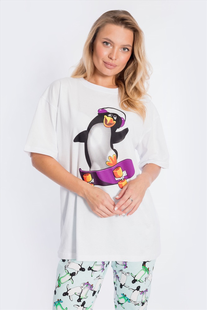 Костюм из кулирки, 100% хлопок, состоит из брюк и футболки. Брюки из кулирки с набивным рисунком, с поясом на резине и манжетами из рибаны. Футболка оверсайз из однотонного полотна, с коротким рукавом и принтом спереди.