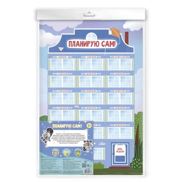 Плакат «Распорядок дня» поможет вам вместе с ребенком составить расписание, которое подходит именно для вашей семьи! Ваш ребенок самостоятельно или с вашей помощью размещает наклейки с задачами напротив времени, уже указанного на плакате. Наклейки с простыми и яркими изображениями будут понятны даже самым маленьким. Плакат можно использовать неоднократно за счет многоразовых наклеек, а возможность менять дни недели позволит составить уникальное расписание на каждый день!