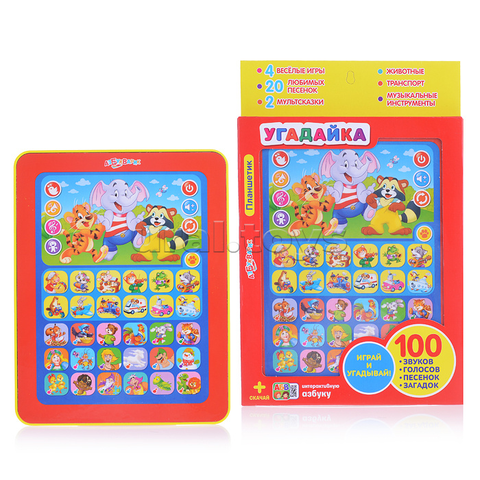 Код: 193341 Страна производитель: Китай Размеры упаковки: 19 x 2 x 29 см Количество в коробке: 25 • Работает от 3-х батареек 1.5V "ААА" (входят в комплект) • Функции: - песенки из мультфильмов. - звуки животных. - звуки транспорта. - звуки музыкальных инструментов. - загадки. - игры. • Материал: пластик. • Соответствует требованиям безопасности продукции. • Для детей от 2-х лет. Комментарии к товару