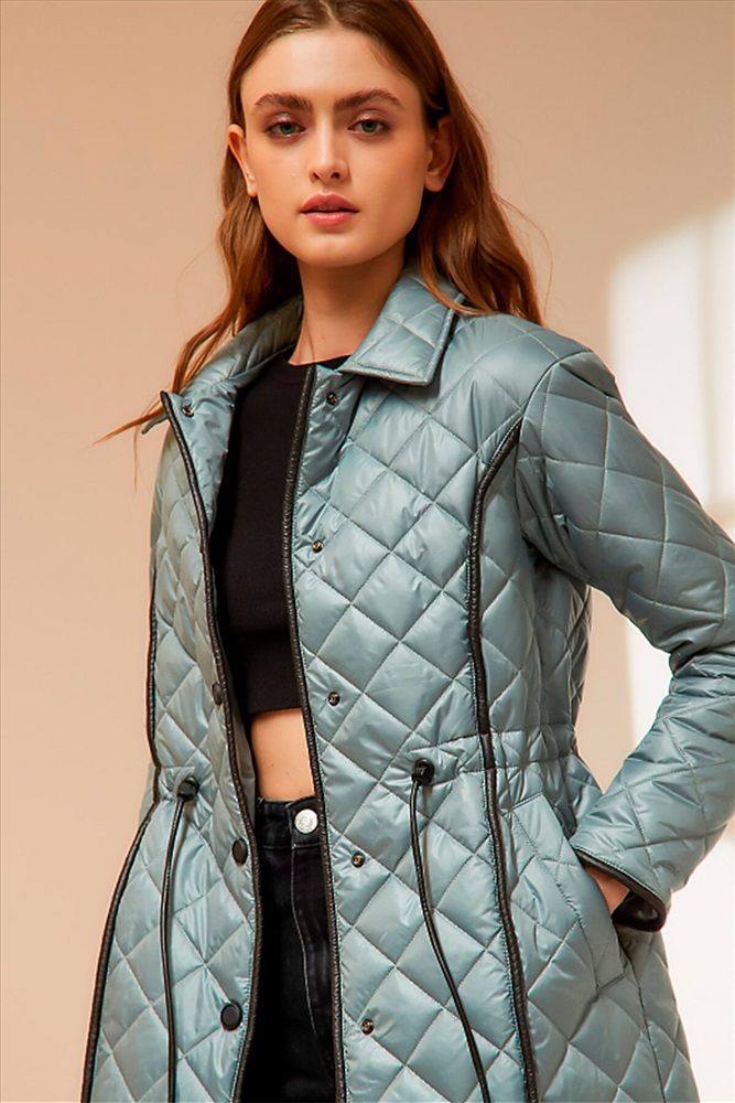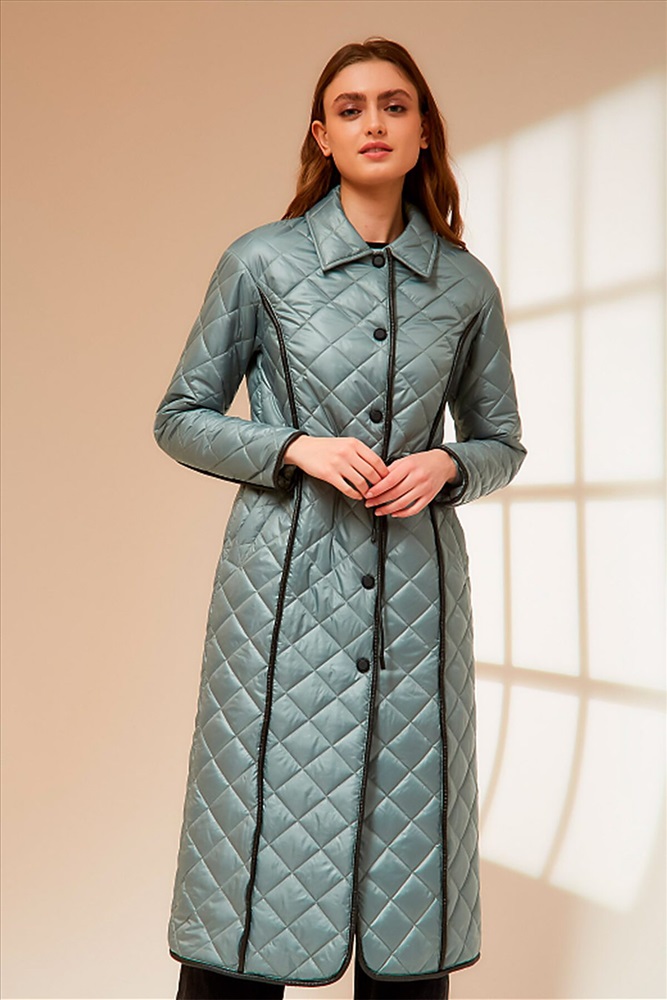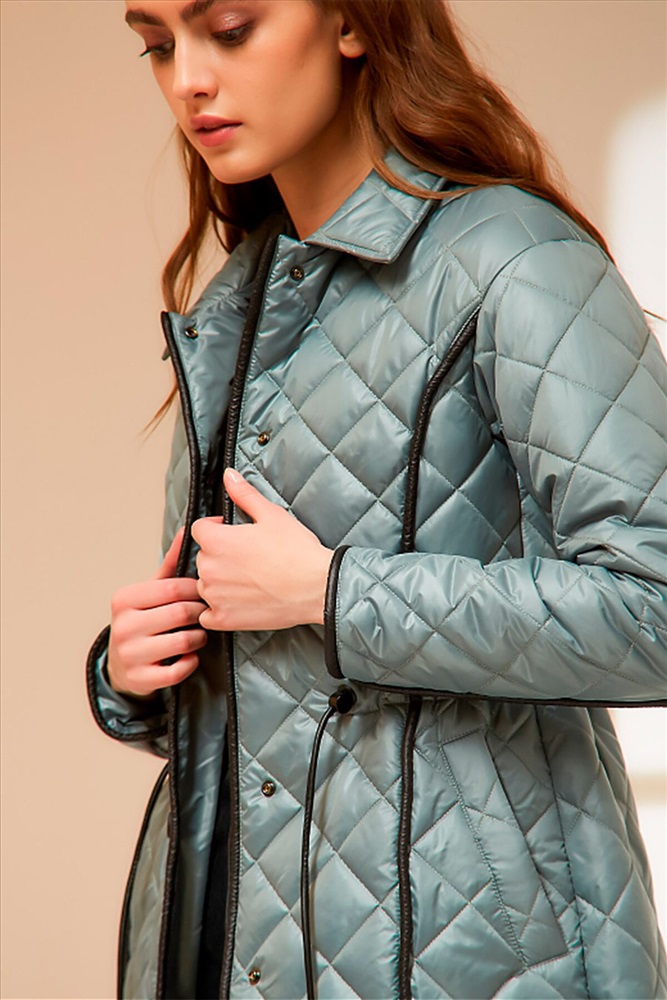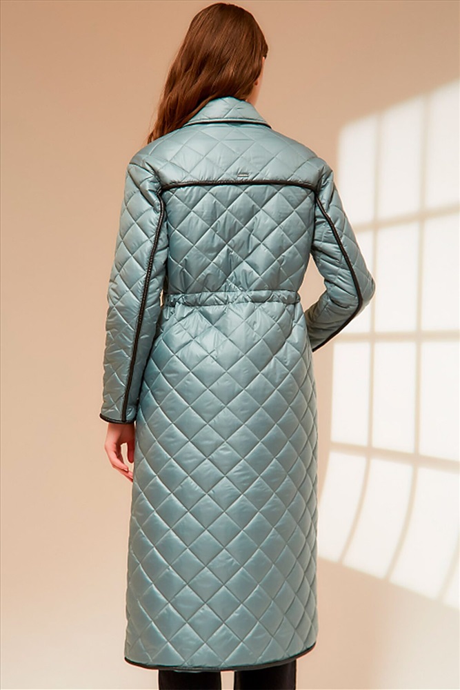 Стильный стеганый однобортный плащ прямого силуэта с кантами и утяжкой на уровне талии. Застежка на кнопках. Кулиска выполнена из эко-кожи. Рукав со спущенным плечом. Имеются два кармана с листочками на кнопках. Есть внутренний карман. Ткань изделия обработана качественной водоотталкивающей пропиткой. Утепление нового поколения ORSOTERM 100 гр., рекомендуемый температурный режим от +10°C до +18°C. Длина изделия: 120 см. Длина рукава: 64 см.
