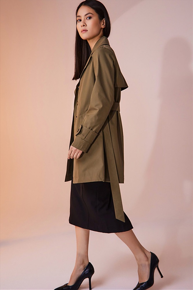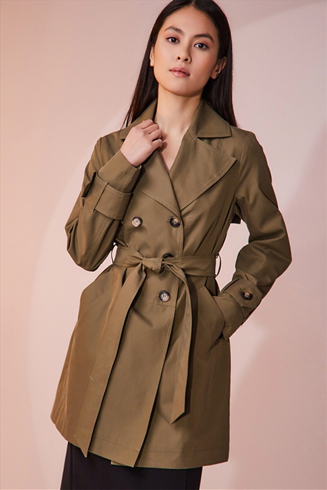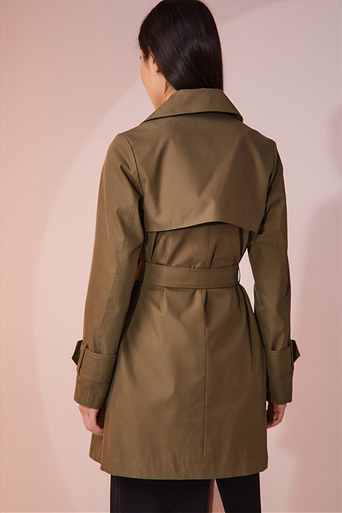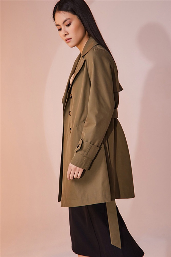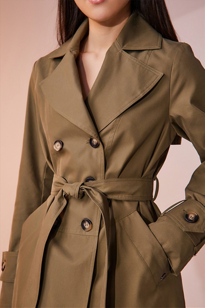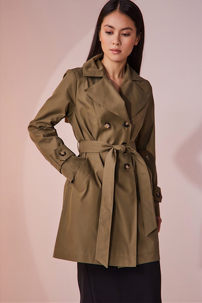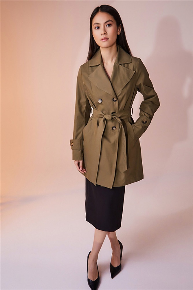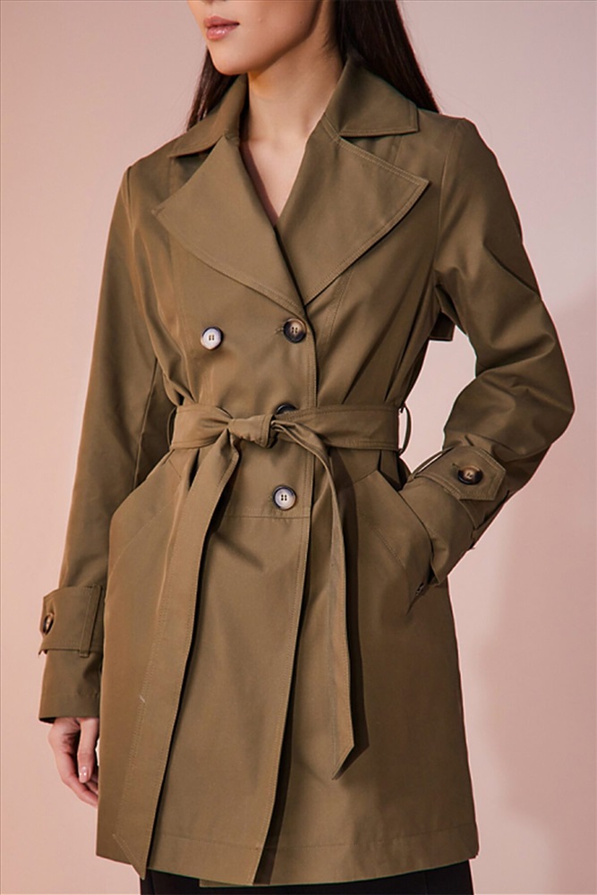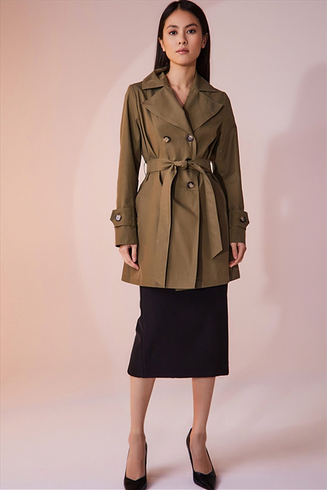 Двубортный плащ выполнен из хлопковой ткани с водоотталкивающей пропиткой. Изделие без утепления, рекомендуемый температурный режим от +17°C до +23°C. Силуэт прямой, с втачным рукавом. В плаще имеются два функциональных кармана, оформленные листочками. Есть возможность утянуться на пояс из основной ткани. Внизу рукав оформлен декоративной патой на пуговице. Длина изделия 84 см. Длина рукава 64 см.