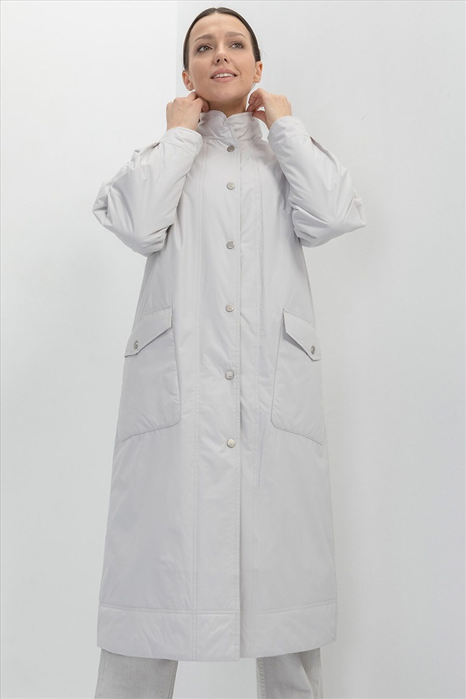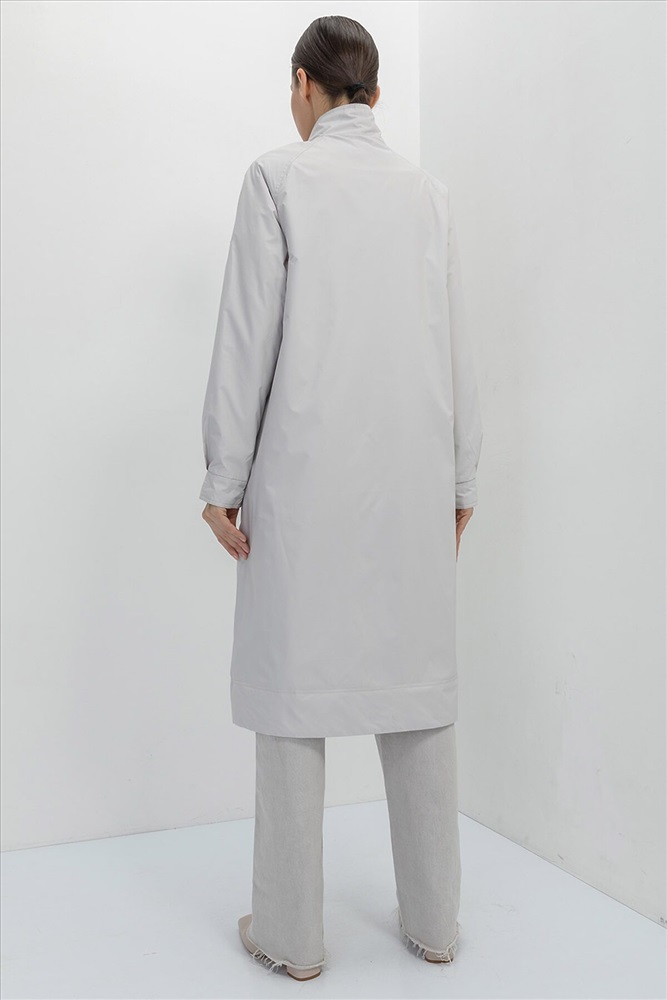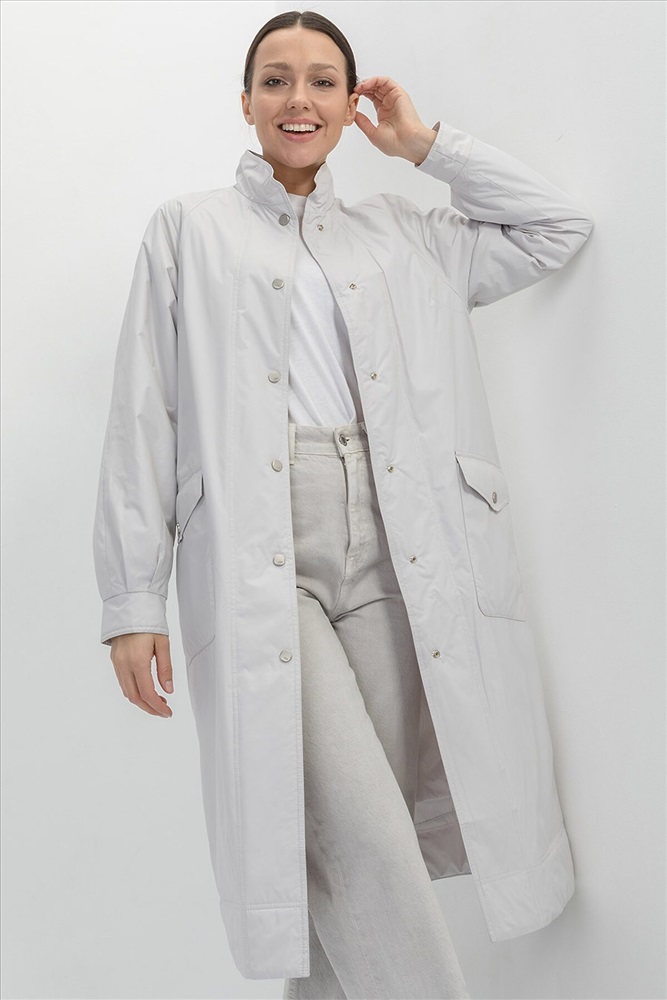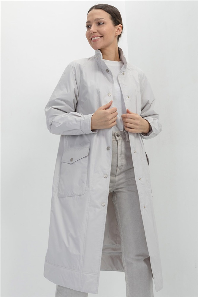 Легкий плащ на утеплении с рукавом-реглан и воротником-стойкой. В изделии имеются два накладных кармана с клапаном на кнопке и один внутренний карман. По низу рукава идет манжета. Застежка на кнопки. Ткань - плащевая с водоотталкивающей пропиткой. Утепление нового поколения ORSOTHERM 60 гр. (от +15 °C до +20 °C). Длина изделия: 110 см Длина рукава:64 см.