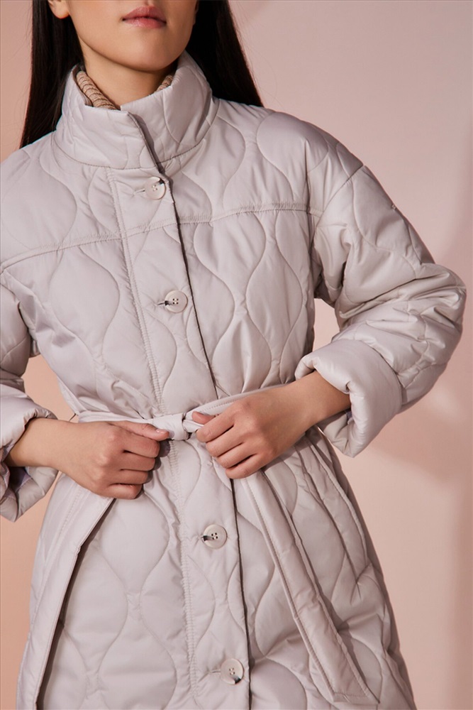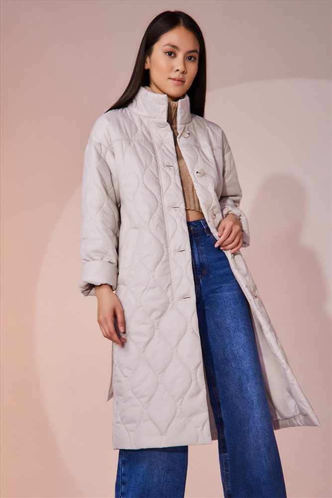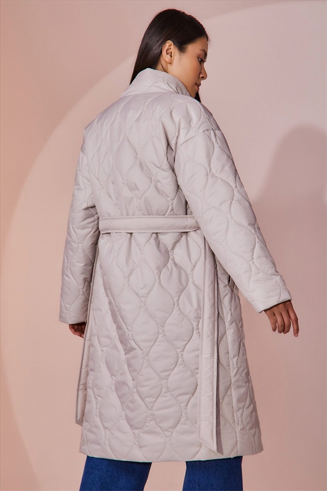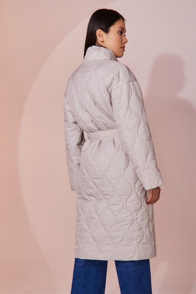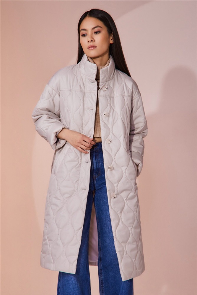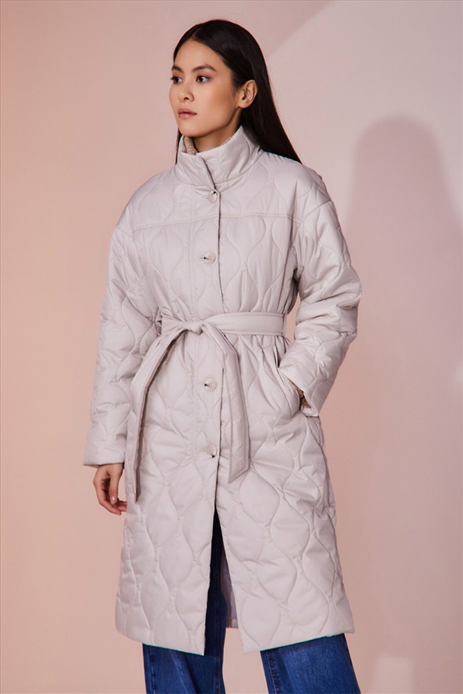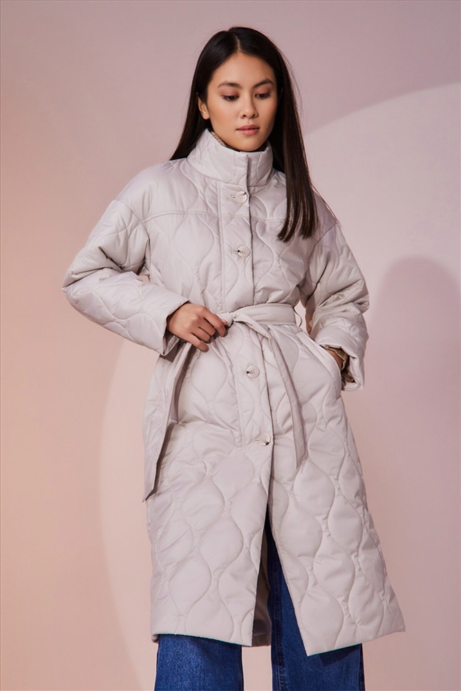 Классический стеганный плащ прямого силуэта с актуально заниженной проймой. Рукав втачной, внизу рассчитан на подгибку. В подвернутом положении он длиной 7:8, тем самым обнажает женское тонкое запястье и делает более хрупким образ своей обладательницы. В изделии есть два кармана, оформленных листочками, а также внутренний карман. В комплекте идет пояс из основной ткани. Ткань плащевая с водоотталкивающей пропиткой, простеганная волной. Утепление - синтепон ОRSOTERM 100гр. Рекомендуемый тепловой режим (от +10°C до +18°C). Длина изделия: 100 см. Длина рукава: 65 см.
