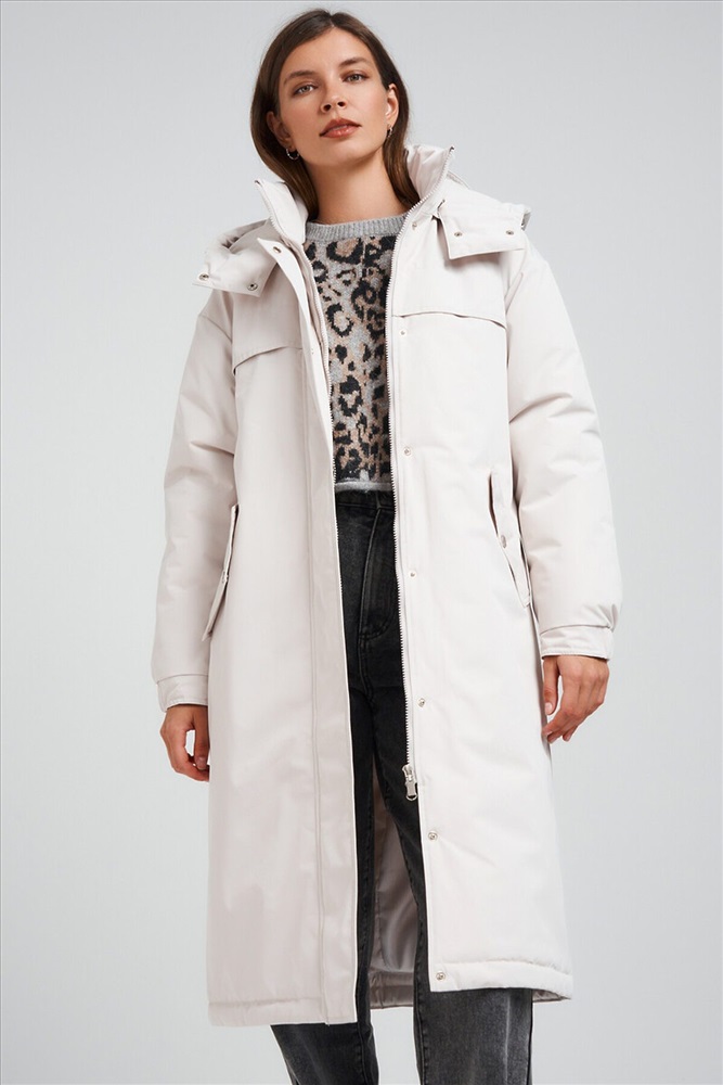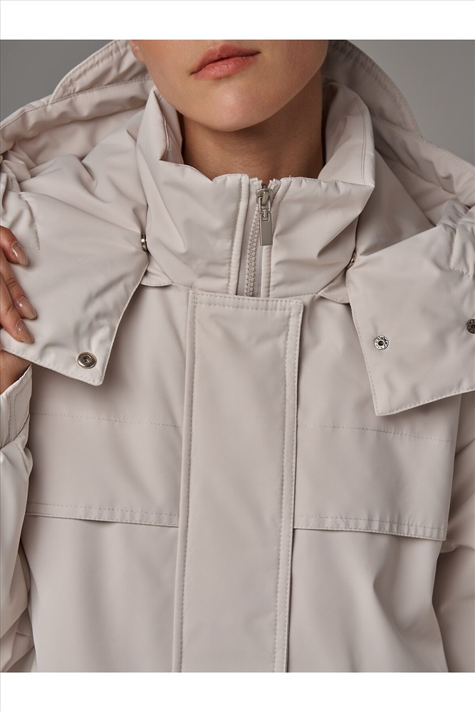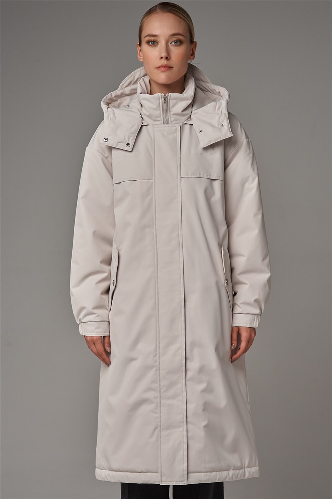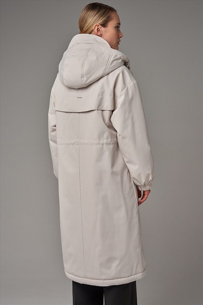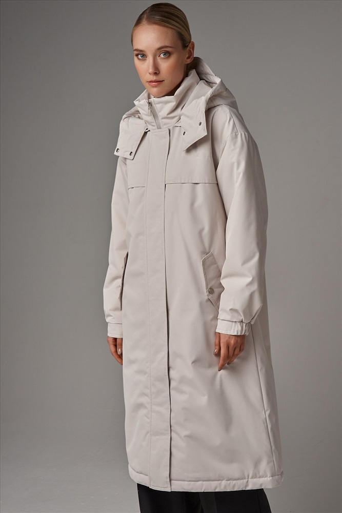 Утепленный плащ прямого силуэта со спущенным рукавом на резинке. Застежка на молнию в цвет изделия и на потайные кнопки. В изделии два функциональных кармана и один внутренний. Капюшон отстежной. Рукав втачной со спущенной линией плеча. По спинке изделия по линии талии есть утяжка с выходом на подкладку. Плащ выполнен из ткани на мембране с качественной водоотталкивающей пропиткой. Температурный режим изделия (от +10°C до +18°C). Утеплитель нового поколения ORSOTERM.150 г/м2.