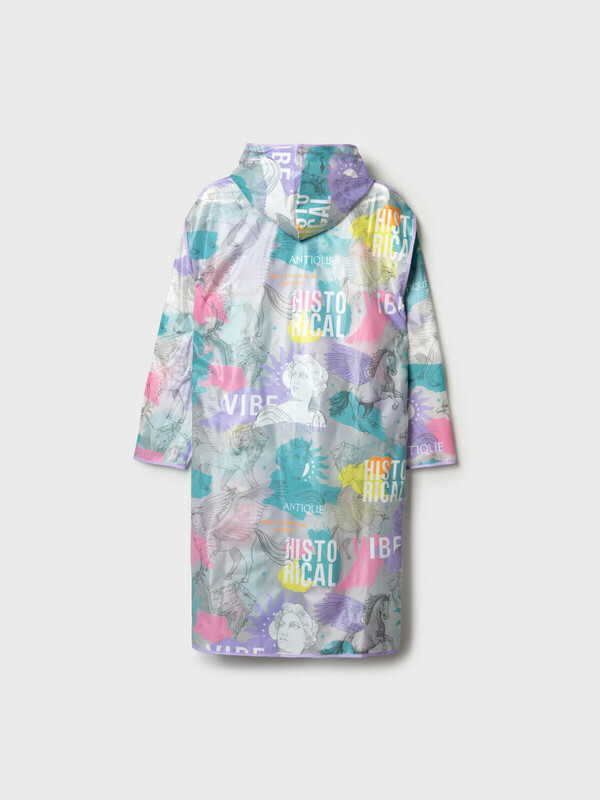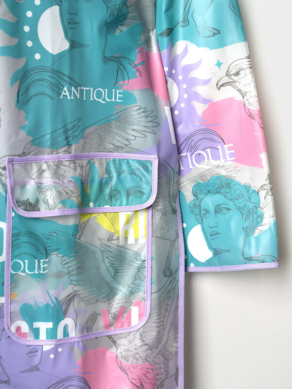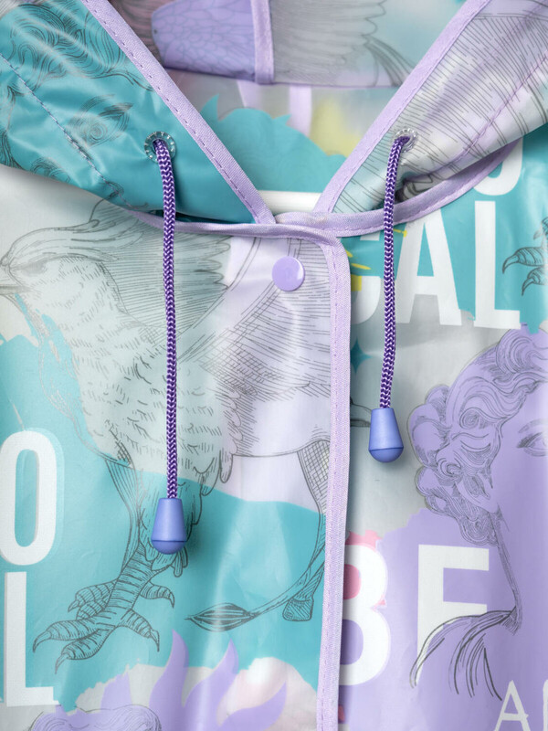 Женский плащ-дождевик с фирменным принтом в коллекцию. Капюшон с утяжкой. Застежка на кнопки. Материал ЭВА. Без подкладки. Модель имеет спереди два накладных кармана с клапаном. Добавлена петелька под капюшоном с внешней стороны, чтобы остальные вещи на вешалке не намокали. Сзади есть светоотражающая полоска. Идеально подходит для парного образа мама-дочь, так как такая модель есть в детских размерах. В комплекте идет непромокаемая сумочка.