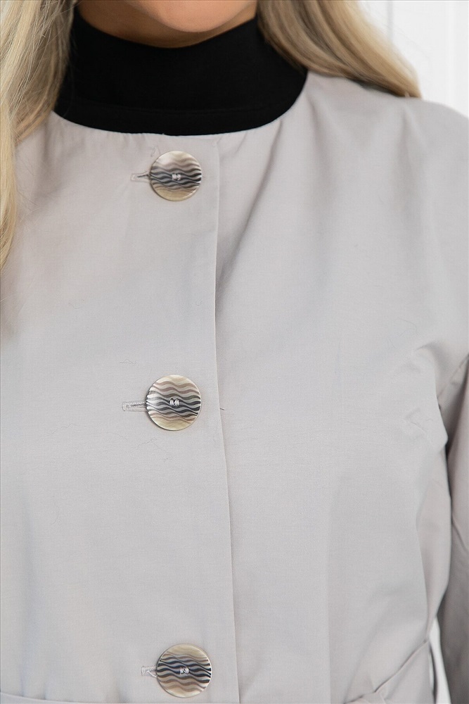 Артикул: П13015-14М. Тип ткани: смесовый. Состав: 65% хлопок, 35% вискоза. Материал: плащевка. Цвет: серый. Принт: отсутствует. Вид застежки: пуговицы. Силуэт: трапеция. Карманы: есть. Подкладка: отсутствует. Декоративные элементы: паты на пуговицах, пояс в комплекте. Длина по спинке от верхней точки плеча: 44-54/ 95 см.