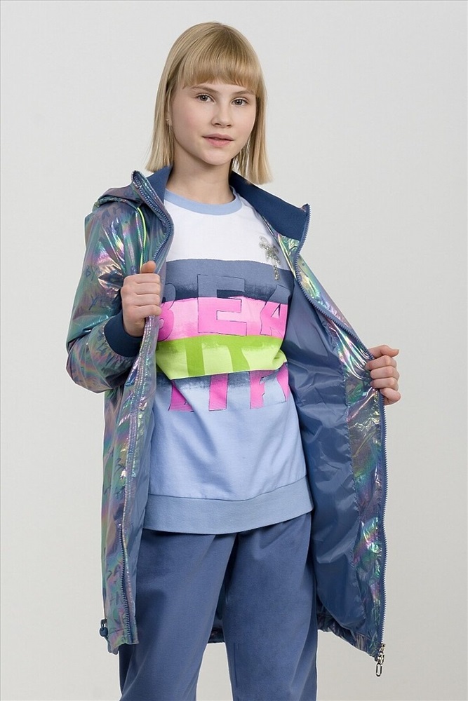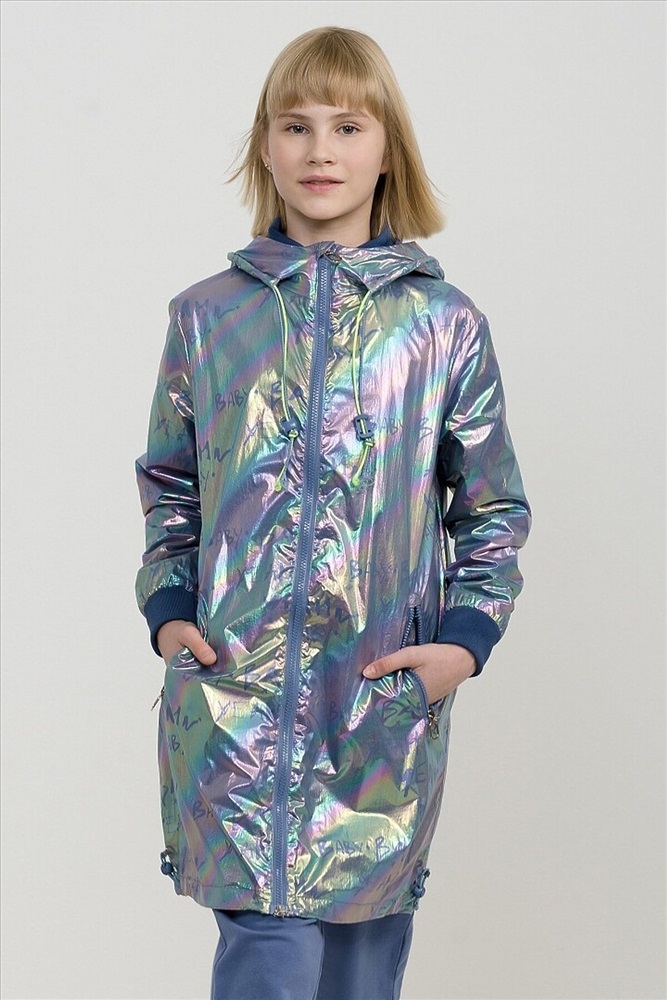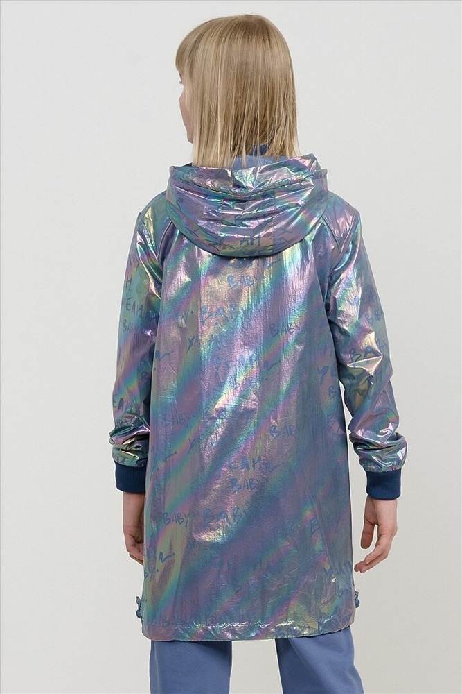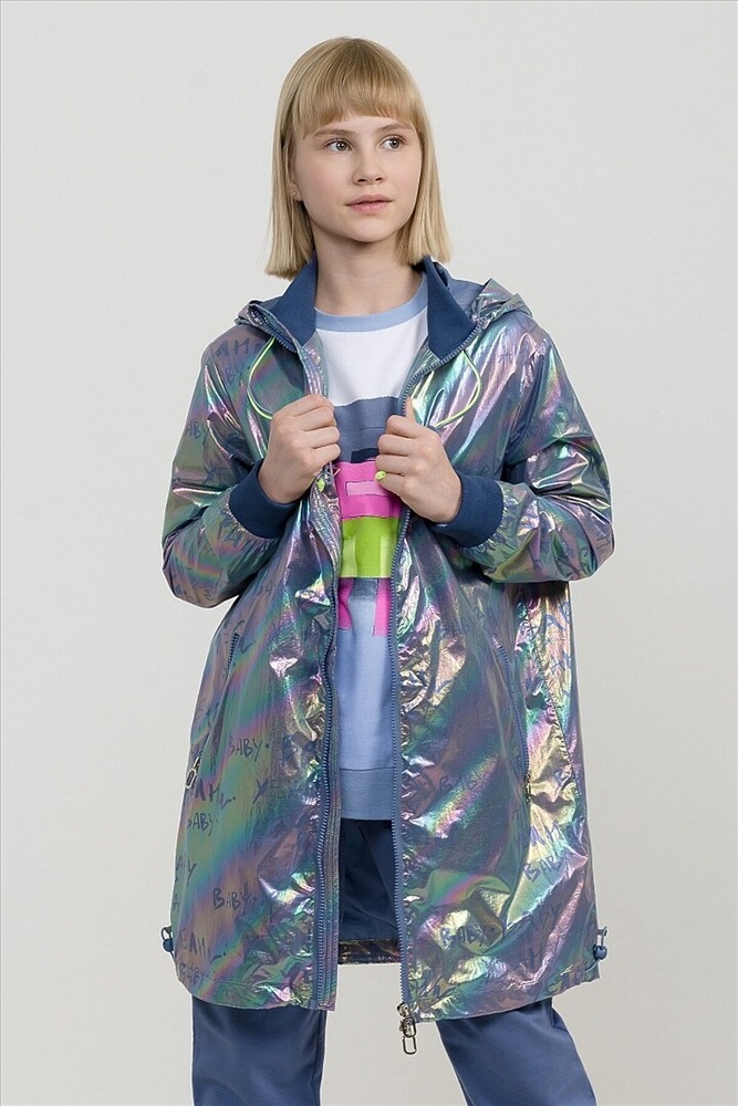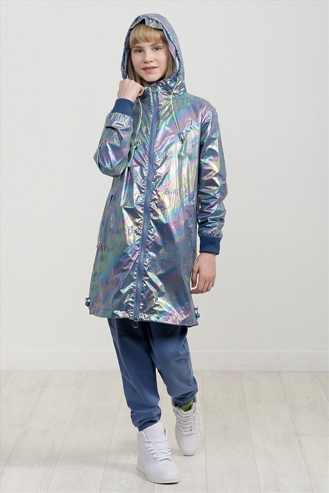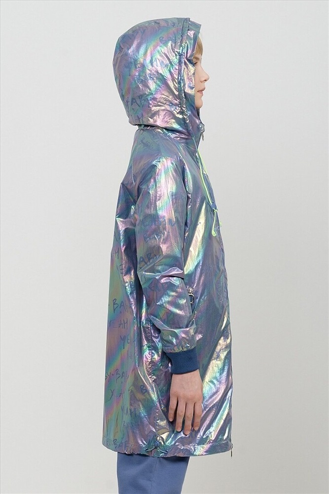 Плащ на тонком подкладе. Рекомендуемый температурный режим не ниже плюс 10 градусов. Ткань с голографическим водоотталкивающим покрытием. Прямой силуэт с регулировкой понизу эластиком со стоппером. Внутренний воротник и манжеты рукавов из рибаны. Оригинальная конструкция капюшона вместо классической утяжки по краю капюшона на шнур с фиксатором спроектирована специальная деталь держатель для декоративной тесьмы, которая регулирует объем капюшона по внешнему краю двойным эластиком с прозрачным наконечником. Световозвращающие элементы в боковых швах.