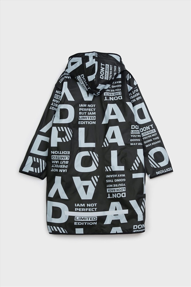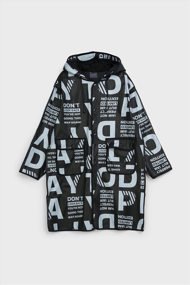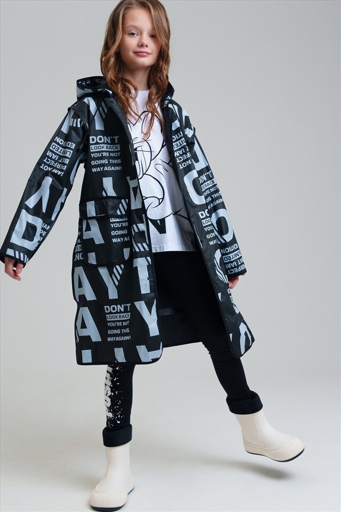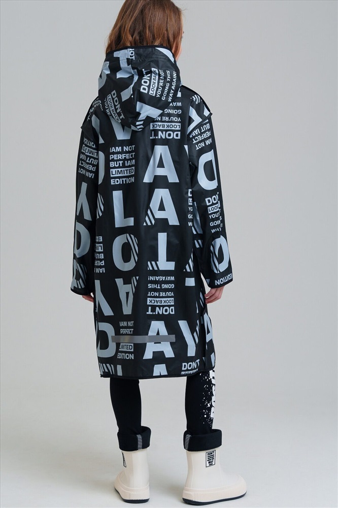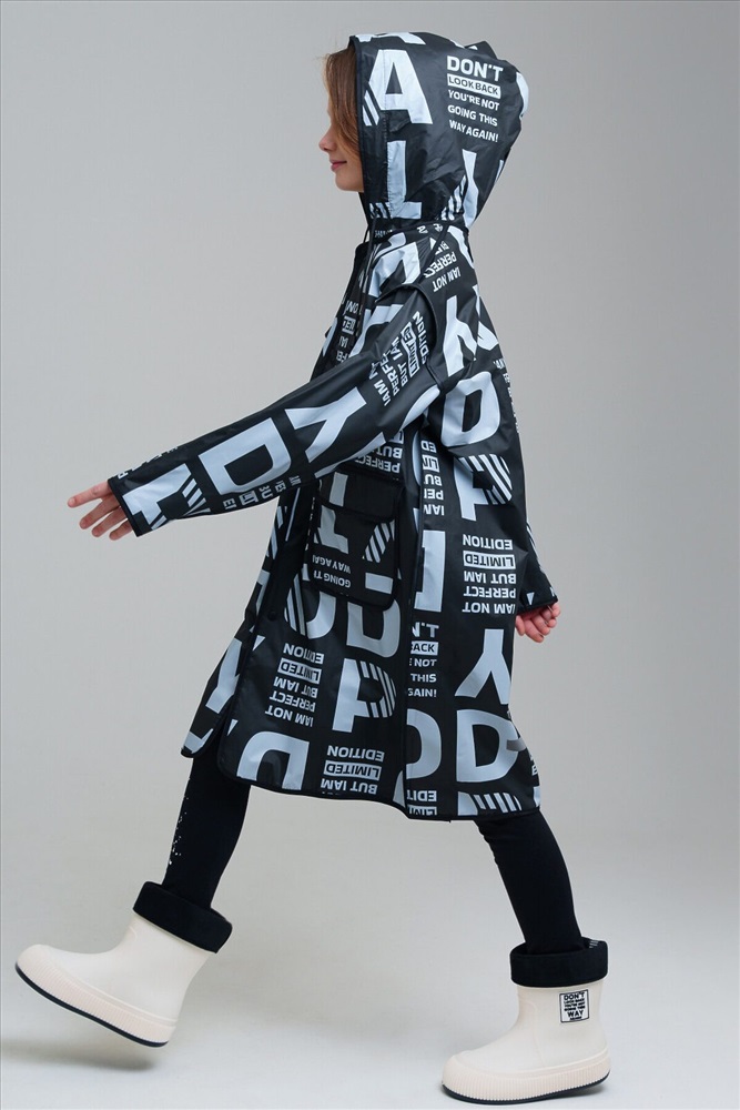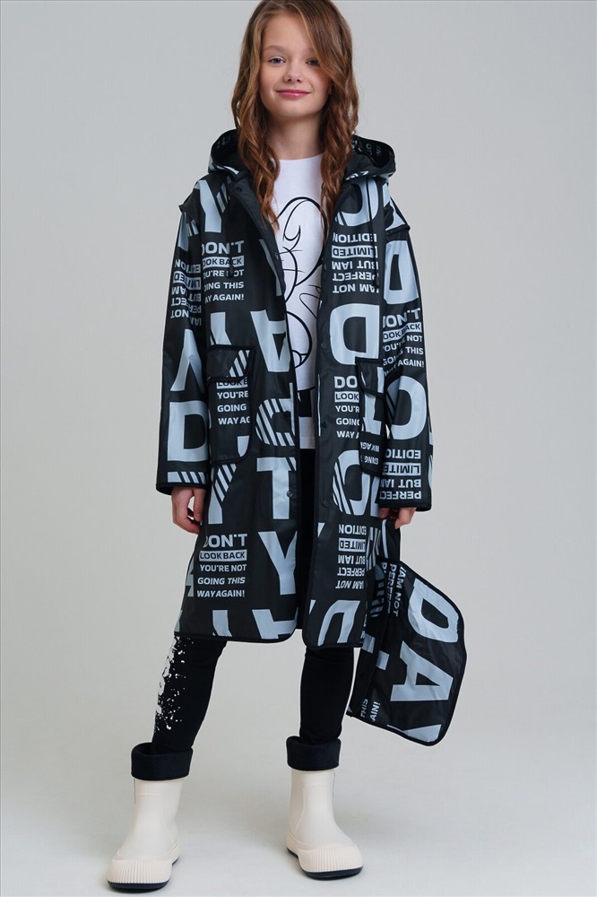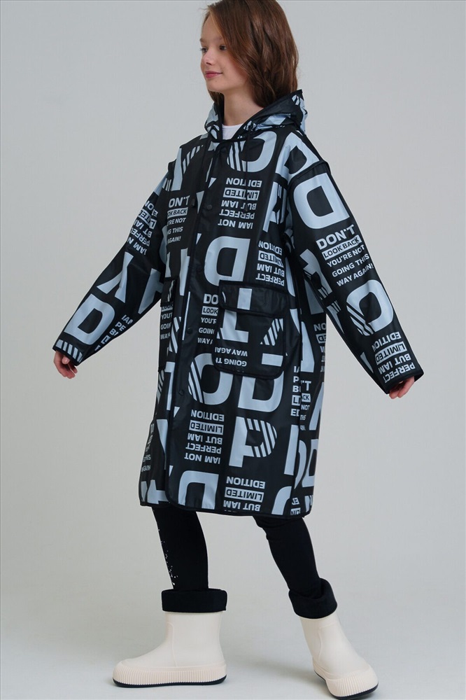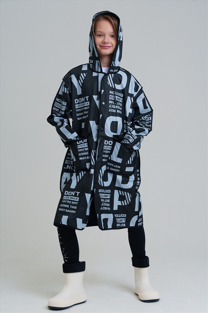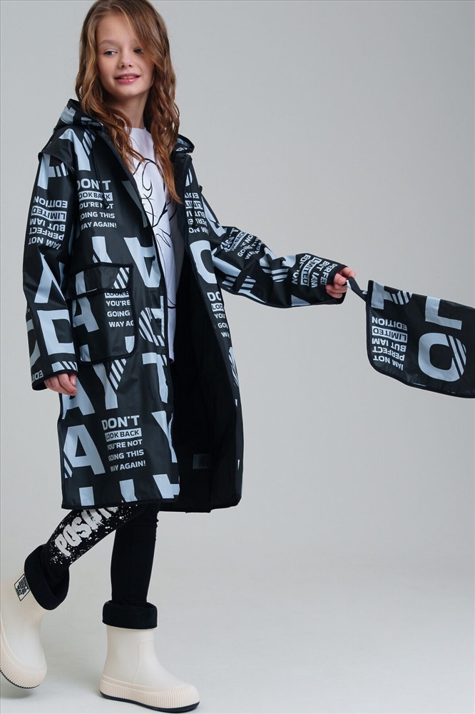 Плащ-дождевик для девочки-подростка с принтом в коллекцию. Капюшон с утяжкой. Застежка на кнопки. Материал ЭВА. Без подкладки. Модель имеет спереди два накладных кармана с клапаном. Добавлена петелька под капюшоном с внешней стороны, чтобы остальные вещи на вешалке не намокали. Сзади есть светоотражающая полоска. Идеально подходит для парного образа мама-дочь, так как такая модель есть в размерах для взрослых. В комплекте идет непромокаемая сумочка.