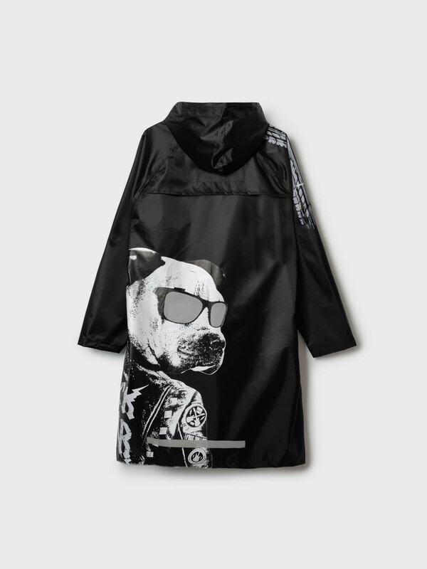 Трендовый дождевик с оригинальным принтом бульдогом для мальчика-подростка. Очки на бульдоге имеют светоотражающий эффект. Плащ выполнен из полиэстера с водоотталкивающим покрытием. Внутри все швы дополнительно проклеены изолирующей тесьмой. Застежка на кнопки. Капюшон на утяжке. Модель имеет спереди два накладных кармана с клапаном. Чтобы в плаще не было жарко, кокетка спинки имеет воздухоотводящие отверстия под клапаном. Сзади есть светоотражающая полоска. Модель идеально сочетается с резиновыми сапогами и зонтом из коллекции. Идеально подходит для парного образа папа-сын, так как такая модель есть в размерах для взрослых. В комплекте идет непромокаемый мешочек.