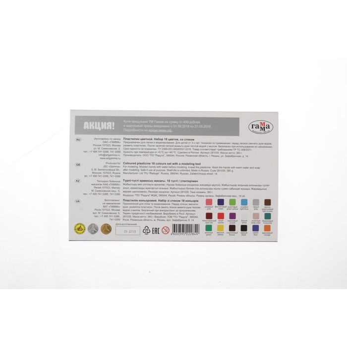 Габариты: 24,5 x 15 x 2 Артикул поставщика: 268019 Страна: Россия В боксе: 10 набор В наборе: 18 набор Состав: Пластилин Материалы: пластилин Фасовка: по 1 набор Индивидуальная упаковка: Картонная упаковка Сертификат: ЕАС Набор: Да Количество цветов: 18 Европодвес: Нет Возраст: От 3 лет В наборе, шт.: 18 Вес, г: 360 Лицензия: Нет Вид упаковки: Коробка картонная Материал: Пластилин Тип: Наборы для лепки Темпер. ограничение НЕ ВЫШЕ ℃: +25 Тематика набора: Лепка Штрихкод на единице товара: Да Температурное ограничение транспортировки: Да Реестр Минпромторга: Да Со стеком (да/нет): Да Пластилин серии "Классическая" собрал в себе все уникальные характеристики и свойства благодаря новой улучшенной формуле.