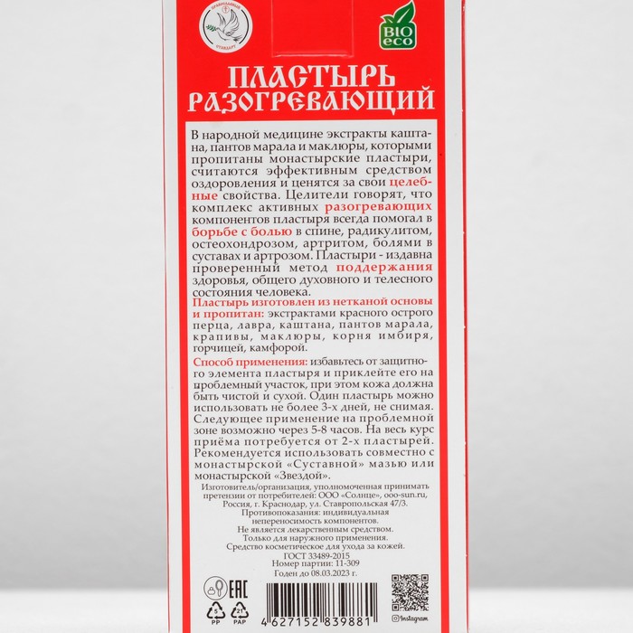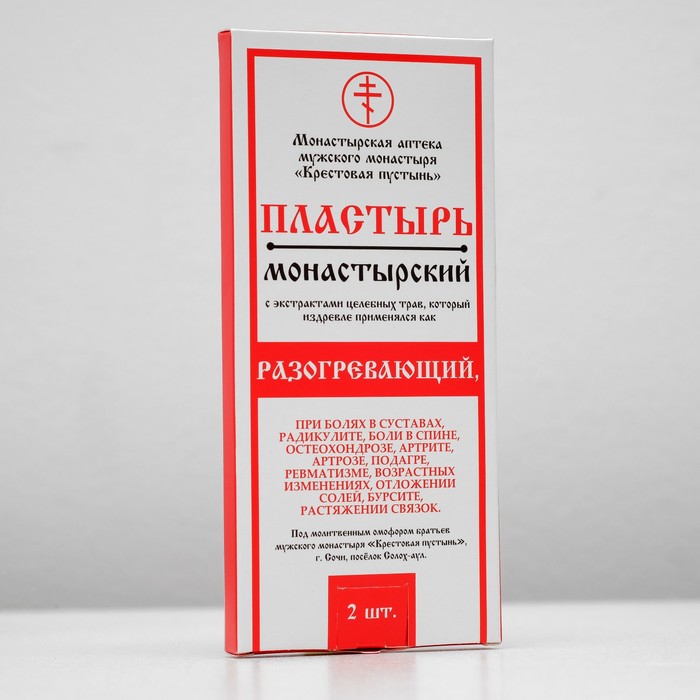 Габариты: 16 x 7,5 x 1 Страна: Россия В боксе: 80 шт Состав: См. на упаковке Материалы: см. на упаковке Фасовка: по 1 шт Индивидуальная упаковка: Картонная коробка / упаковка Сертификат: ЕАС Длина, см: 10 Ширина, см: 7 В упаковке, шт.: 2 Вид: Согревающий Влагостойкость: Нет В народной медицине экстракты каштана, пантов марала и маклюры, которыми пропитаны монастырские пластыри, считаются эффективным средством оздоровления и ценятся за свои целебные свойства. Целители говорят, что комплекс активных разогревающих компонентов пластыря всегда помогал в борьбе с болью в спине, радикулитом, остеохондрозом, артритом, болями в суставах и артрозом. Пластыри - издавна проверенный метод поддержания здоровья, общего духовного и телесного состояния человека. Пластырь изготовлен из нетканой основы и пропитан: экстрактами красного острого перца, лавра, каштана, пантов марала, крапивы, маклюры, корня имбиря, горчицей, камфорой. Способ применения: избавьтесь от защитного элемента пластыря и приклейте его на проблемный участок, при этом кожа должна быть чистой и сухой. Один пластырь можно использовать не более 3-х дней, не снимая. Следующее применение на проблемной зоне возможно через 5-8 часов. На весь курс приёма потребуется от 2-х пластырей. Рекомендуется использовать совместно с монастырской «Суставной» мазью или монастырской «Звездой». Противопоказания: индивидуальная непереносимость компонентов. Комментарии к товару