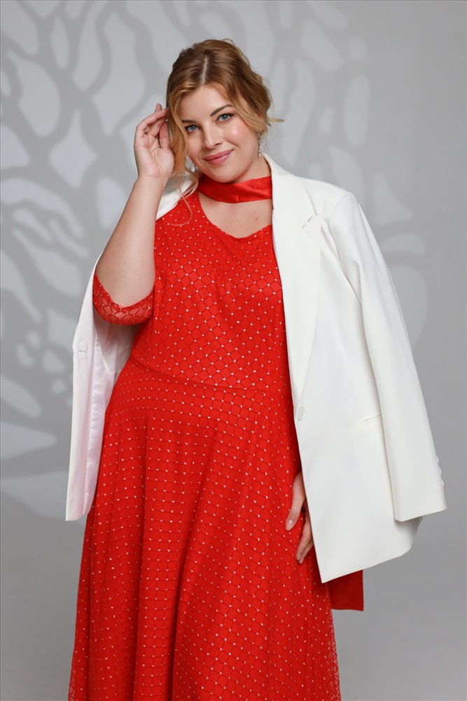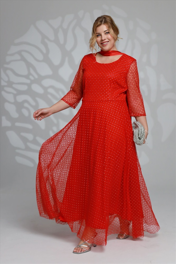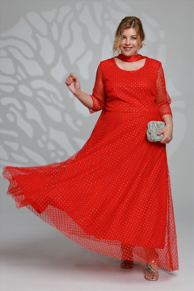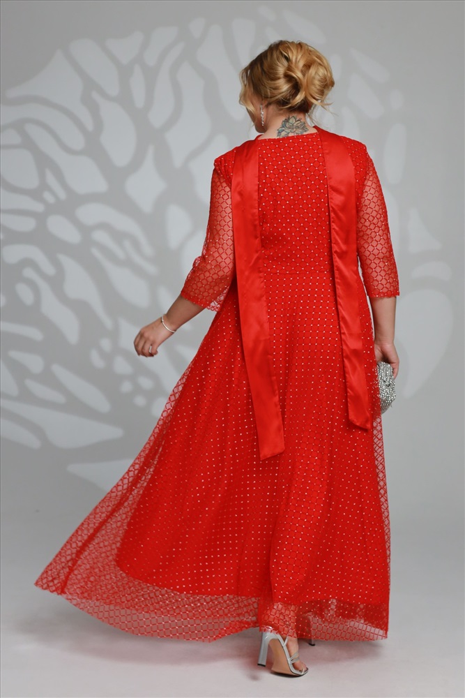 Элегантное платье из мягкой струящейся ткани - подчеркнет вашу женственность и изящность. Модель без подплечников, имеет прозрачные рукава ¾. Полуприлегающий верх идет с классическим круглым вырезом. Платье отрезное по линии талии. Вытачки на груди и по спинке обеспечивают оптимальную посадку по фигуре. Линия талии подчеркнута с помощью пояса, который можно завязать по желанию (в виде банта). Свободная юбка создает женственный силуэт и искусно обыгрывает бедра. Фатиновый верх платья с флоковым напылением в оригинальный принт добавляет модели воздушности и лёгкости. Яркий клатч и туфли на каблуках станут идеальным дополнением к нарядному образу.