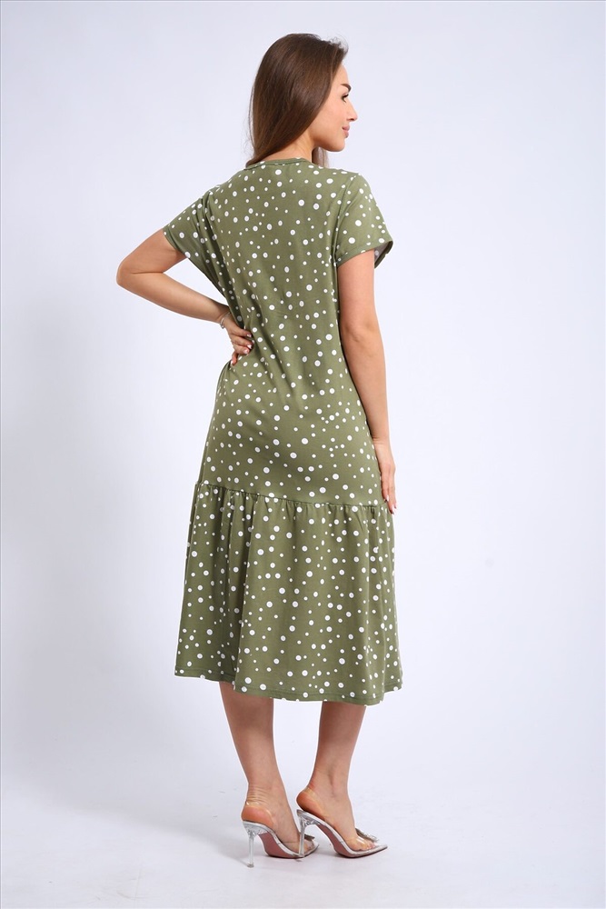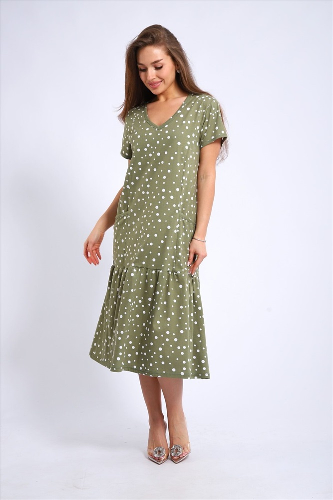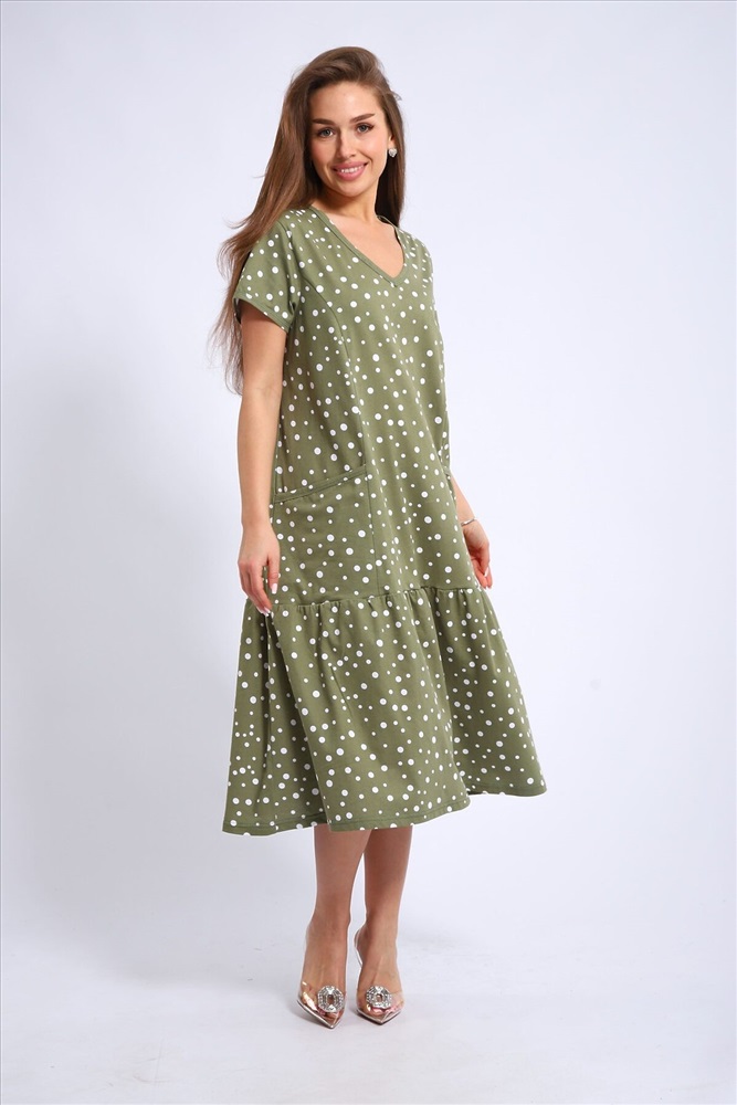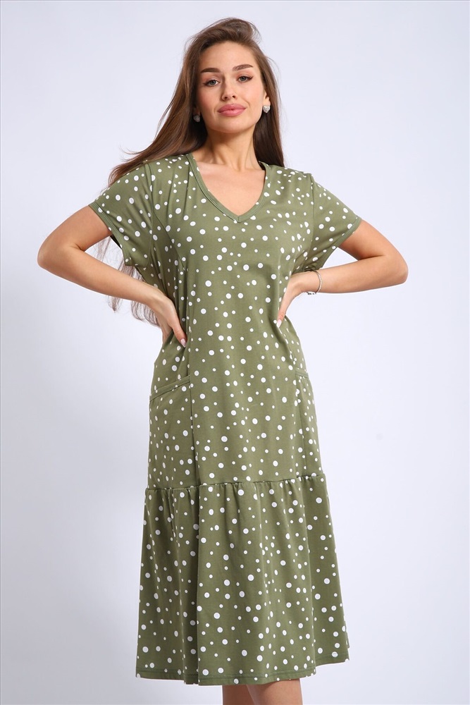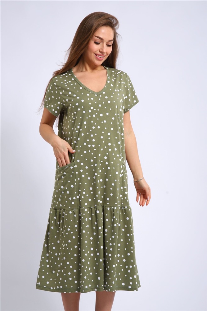 Платье женское выполнено из набивного трикотажного полотна кулирка. Платье свободного силуэта, с коротким рукавом. Вырез горловины намыс, накладные карманы. По низу оборка.