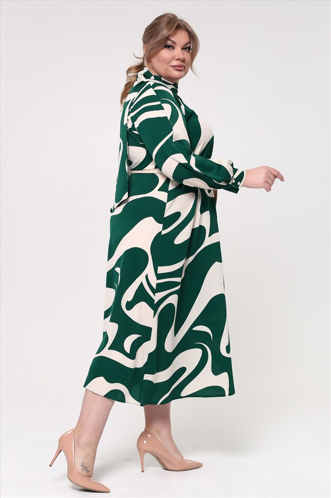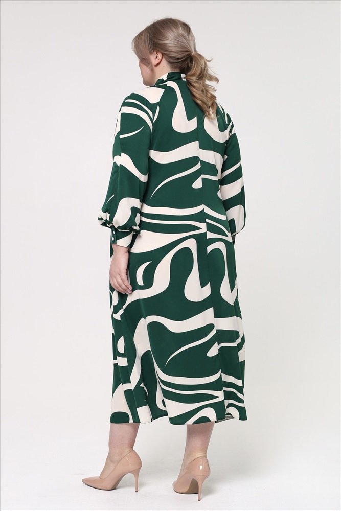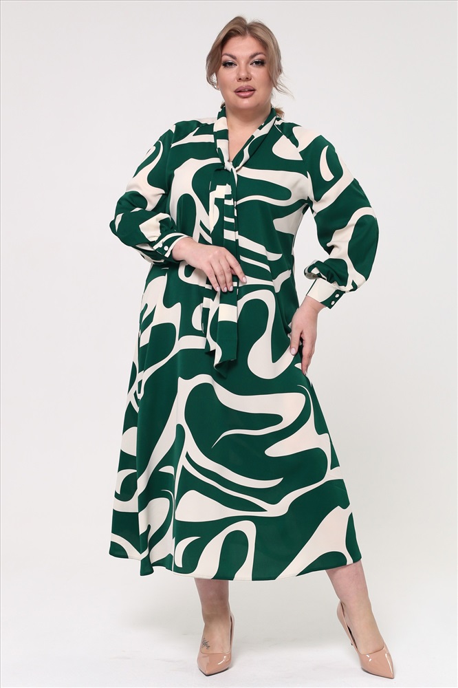 Платье V-вырез с завязкой на вороте бежево-зеленые разводы