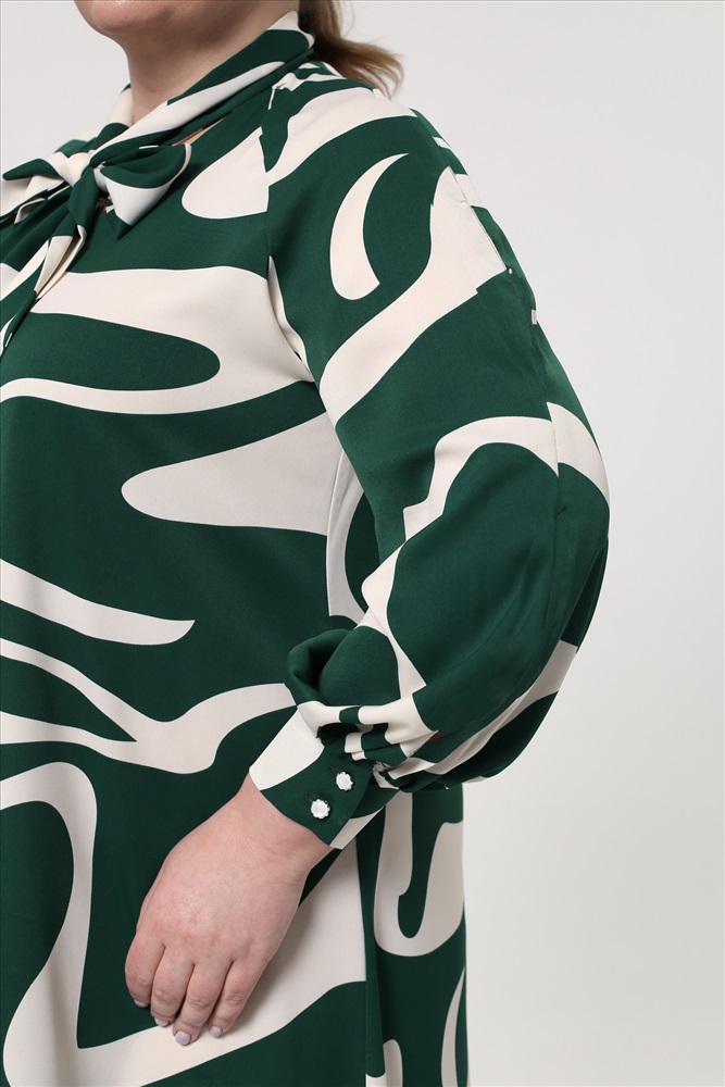 Платье выполнено из нежной, струящейся, приятно прилегающей к телу ткани. Изящный V-вырез, дополненный завязкой на груди, добавляет модели женственности. Свободные рукава - реглан полной длины присобраны по низу на широкие манжеты, застегиваются на изящные пуговки. Рукава декорированы небольшими разрезами сверху. Свободный крой стройнит, скрывая недостатки фигуры. Центральный шов по спинке способствует оптимальной посадке по фигуре. Актуальный принт добавляет динамичности и оригинальности. Модель отлично сочетается с любыми вещами в гардеробе, а значит это незаменимый помощник выглядеть каждый день по-новому.