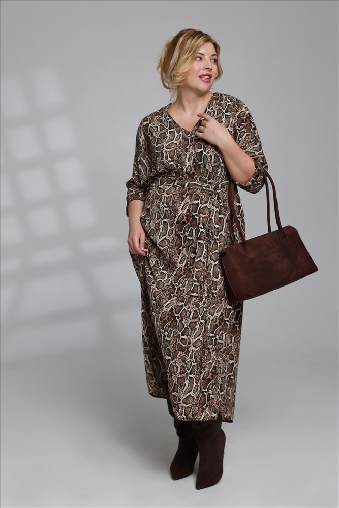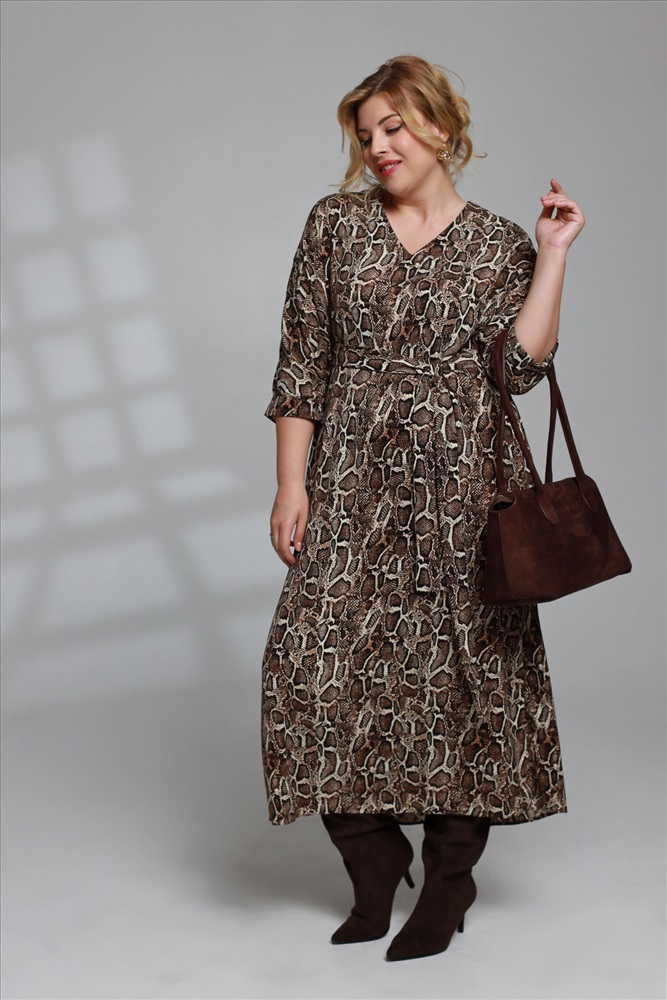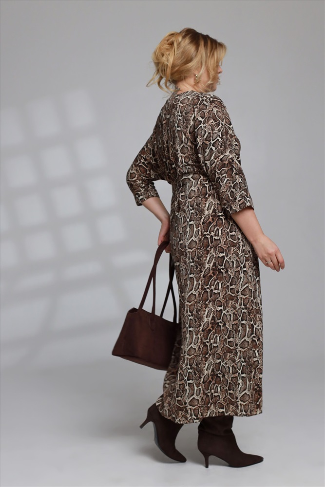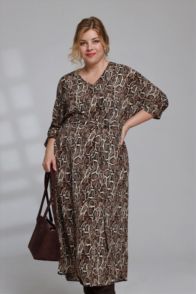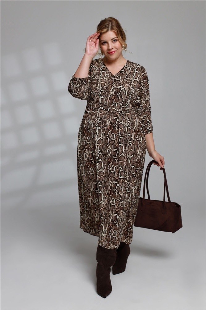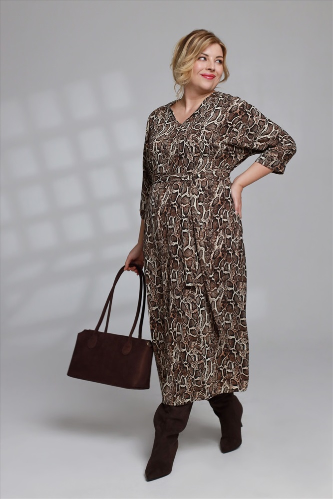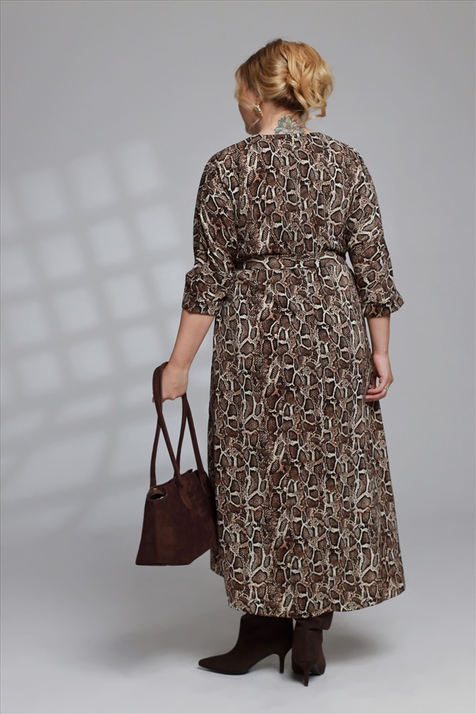Платье V-вырез с завязкой на вороте "змеиный принт" бежевое