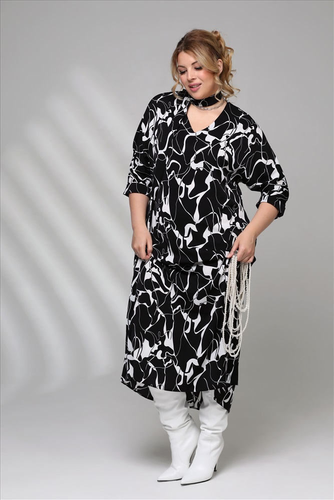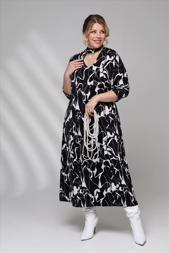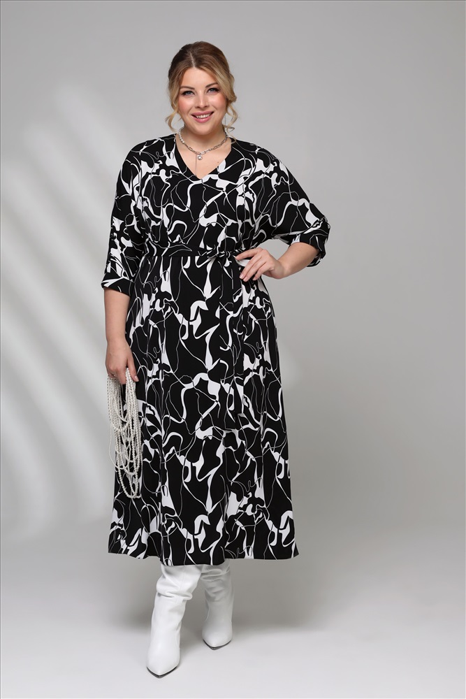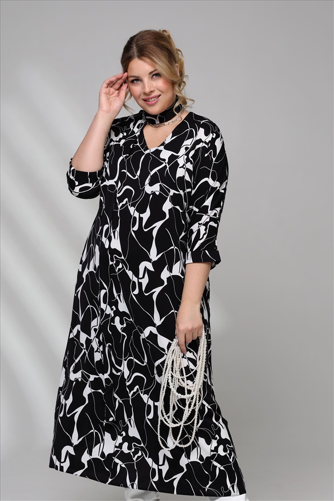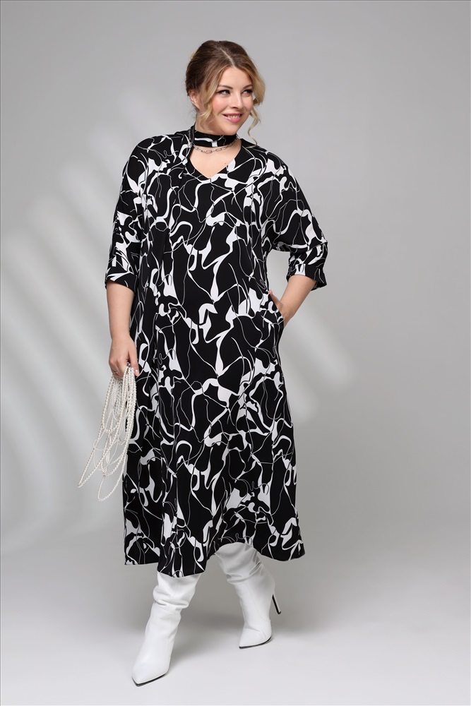 Платье выполнено из нежной, струящейся, приятно прилегающей к телу ткани. Изящный V-вырез добавляет женственности. Цельнокроеные рукава длиной 3/4 оформлены узкой планкой по низу. Свободный крой стройнит, скрывая недостатки фигуры. Центральный шов по спинке способствует оптимальной посадке по фигуре. Актуальный принт добавляет динамичности и оригинальности. По желанию можно присобрать талию поясом в тон. Платье подойдет для офисного стиля с базовым пиджаком и обувью на высоких каблуках. Модель отлично сочетается с любыми вещами в гардеробе, а значит это незаменимый помощник выглядеть каждый день по-новому.