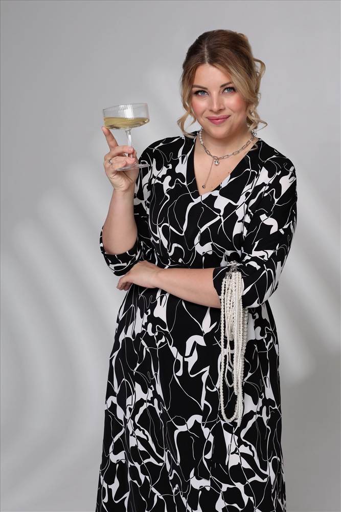 Платье V-вырез с завязкой на вороте "белые разводы" черное