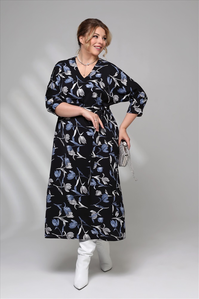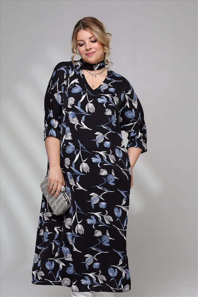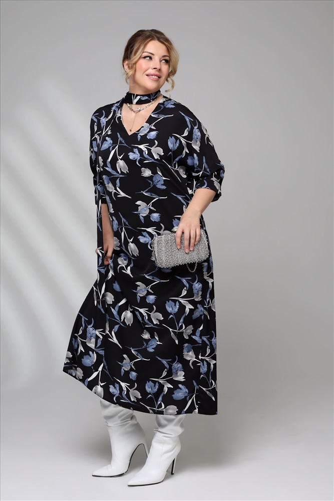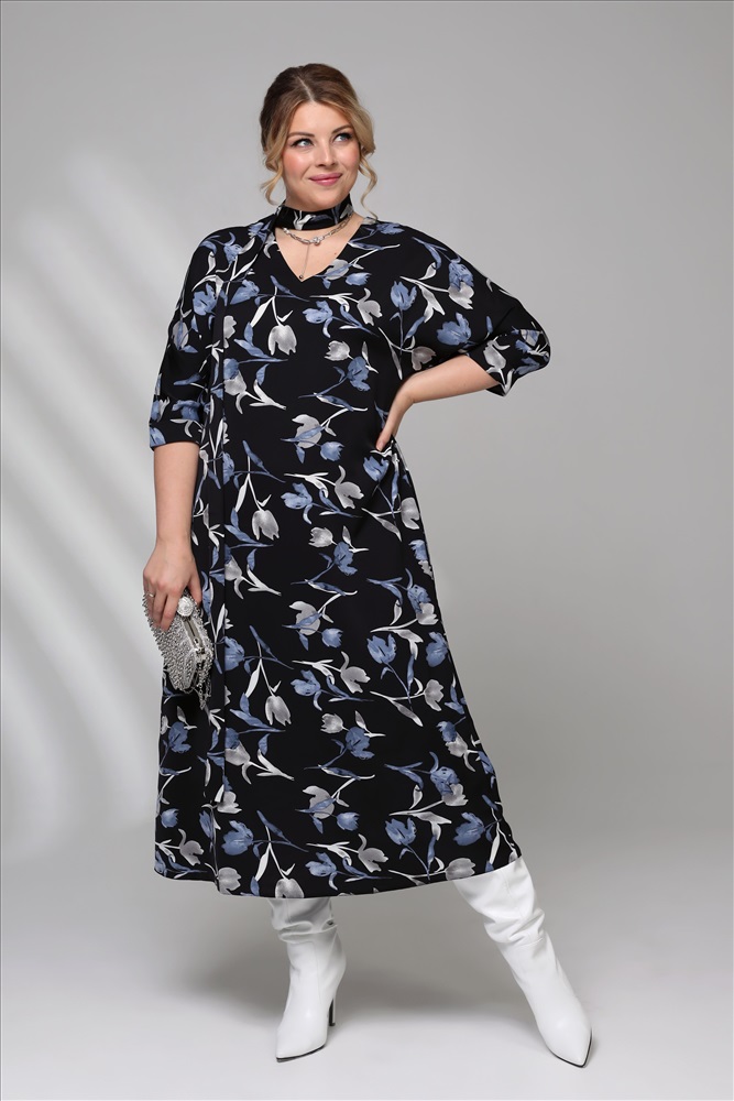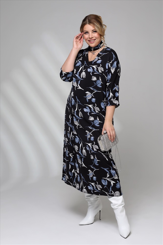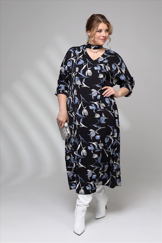 Платье выполнено из нежной, струящейся, приятно прилегающей к телу ткани. Изящный V-вырез добавляет женственности. Цельнокроеные рукава длиной 3/4 оформлены узкой планкой по низу. Свободный крой стройнит, скрывая недостатки фигуры. Центральный шов по спинке способствует оптимальной посадке по фигуре. Актуальный принт добавляет динамичности и оригинальности. По желанию можно присобрать талию поясом в тон. Платье подойдет для офисного стиля с базовым пиджаком и обувью на высоких каблуках. Модель отлично сочетается с любыми вещами в гардеробе, а значит это незаменимый помощник выглядеть каждый день по-новому.