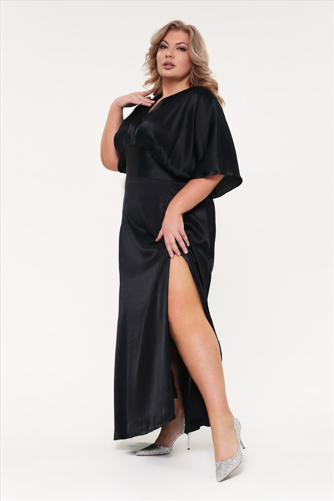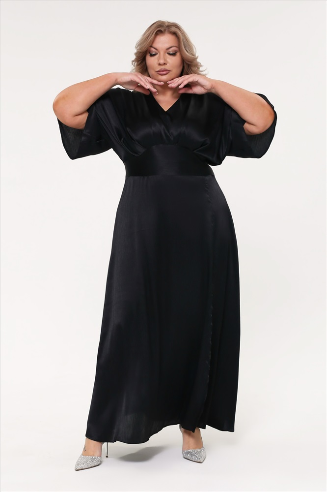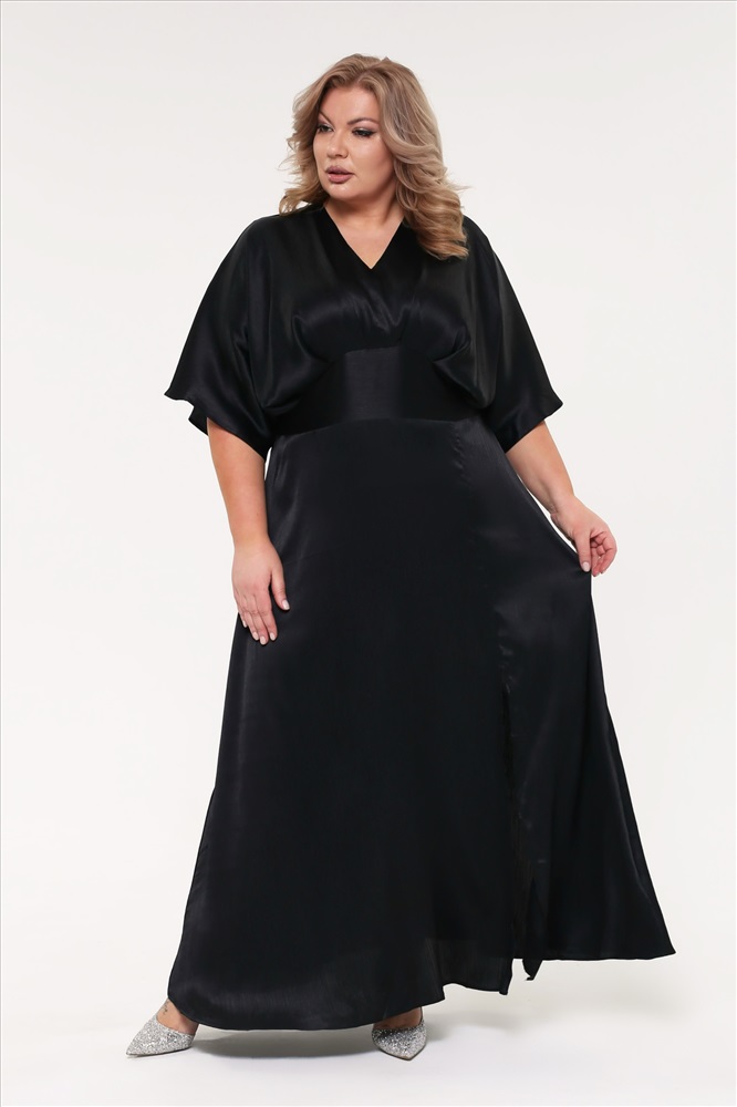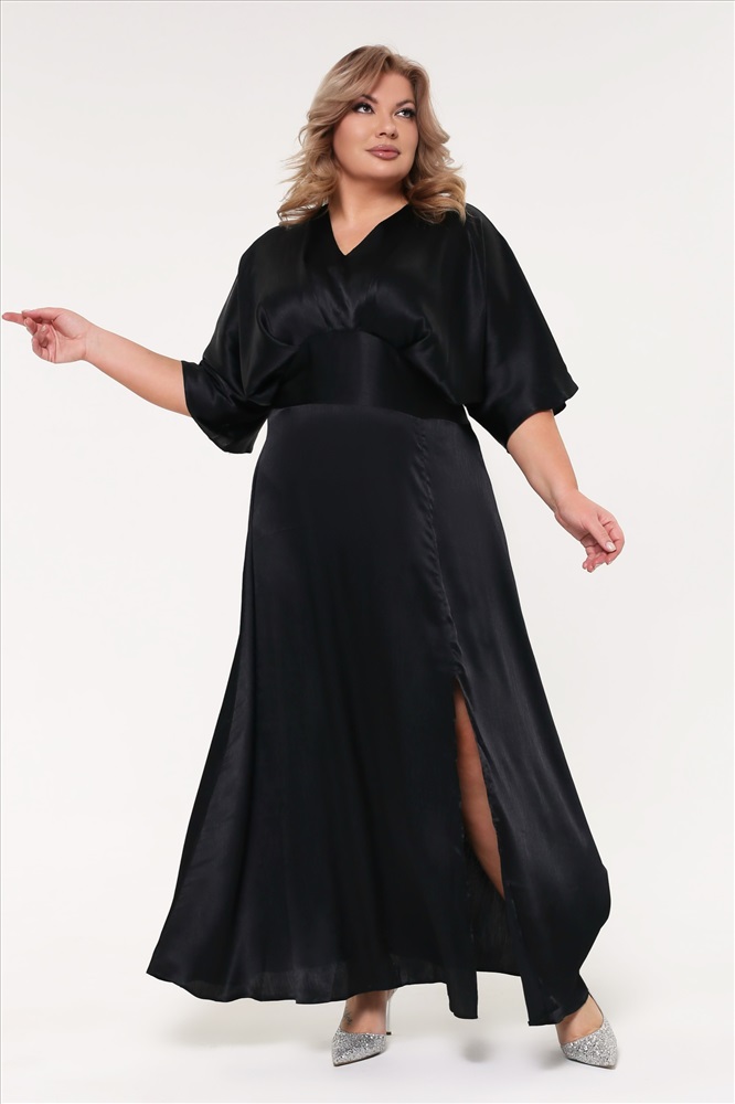 Платье шелковое V-вырез со сборкой под грудью с разрезом черное