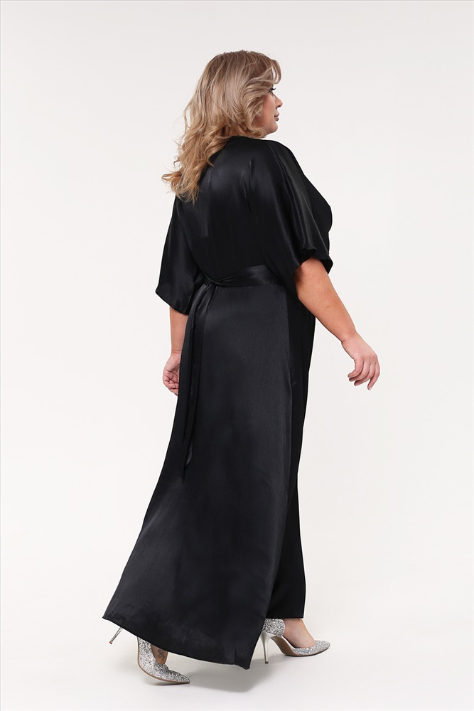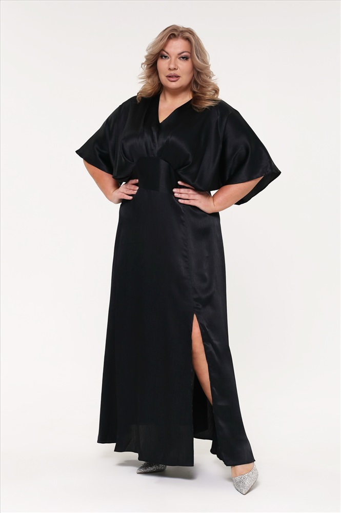 Элегантное платье из мягкого струящегося материала. Цельнокроеные воздушные рукава длиной 3/4 подчеркивают романтичность и утонченность силуэта. Модель имеет V-образный вырез. Широкий втачной пояс-кокетка ставит акцент на линии талии и добавляет женственности. Расклешенная струящаяся юбка с глубоким кокетливым разрезом сбоку искусно обыгрывает область бедер. Свободный крой не сковывает движений и обеспечивает максимальный комфорт в течение всего дня. Стильное платье идеально подойдет для торжественных мероприятий разного характера. Подчеркните лаконичность образа оригинальными аксессуарами, туфлями на высоких каблуках или стильными ботфортами.