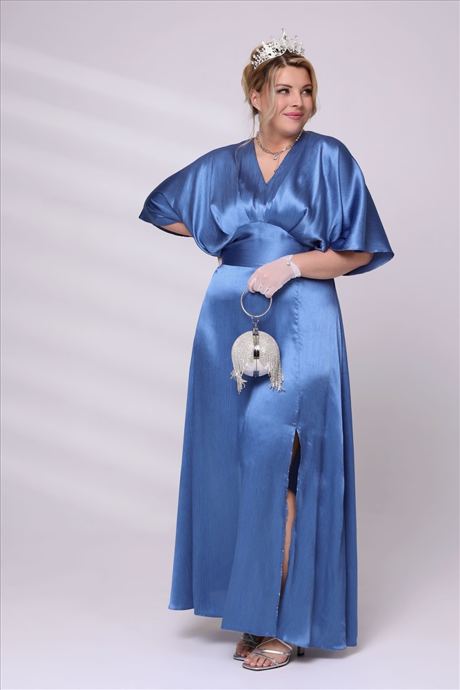 Платье шелковое V-вырез со сборкой под грудью с разрезом синее