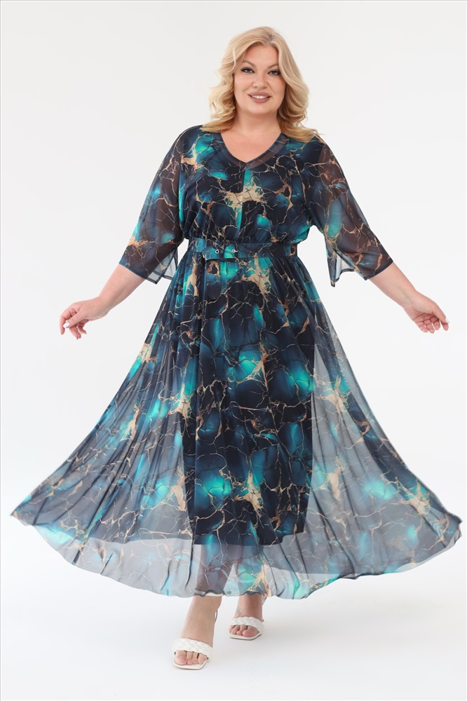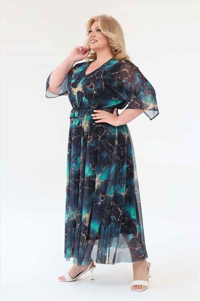 Элегантное платье из мягкого материала - подчеркнет вашу женственность и изящность. Модель без подплечников, имеет свободные цельнокроеные рукава длиной ¾ с небольшими разрезами по низу. Полуприлегающий верх идет с женственным V-образным вырезом. Платье отрезное по линии талии. Вытачки на груди и по спинке обеспечивают оптимальную посадку по фигуре. Линия талии подчеркнута с помощью ремня в тон. Свободная юбка создает женственный силуэт и искусно обыгрывает бедра. Фатиновый верх платья с оригинальным принтом добавляет модели воздушности и лёгкости. Яркий клатч и туфли на каблуках станут идеальным дополнением к нарядному образу.