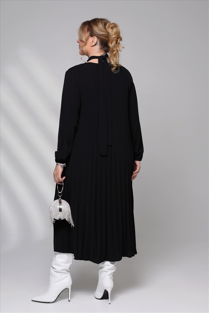 Стильное женское платье трапеция из мягкого гофрированного материала. Имеет классический V-образный вырез. Рукава полной длины по низу дополнены тонкой резинкой. Аккуратная плиссировка зрительно вытягивает силуэт и визуально стройнит. Полуприлегающий силуэт и мягкий материал искусно обыгрывают фигуру и дарят комфорт в течение всего дня. Стильный клатч и туфли на каблуках станут идеальным дополнением к нарядному образу.