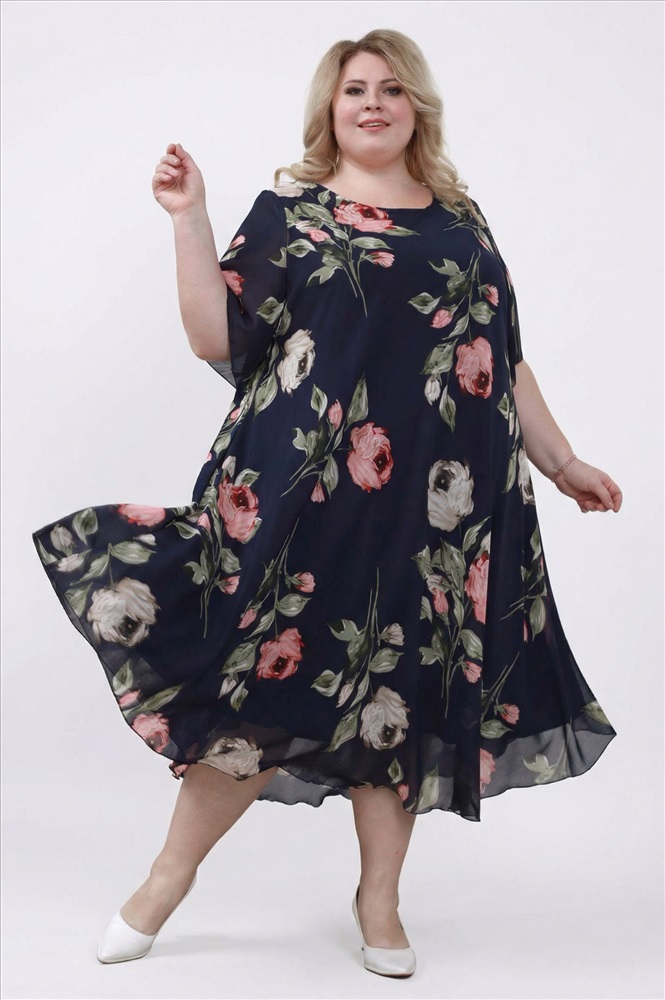 Платье "Розовые розы" шифон длинное расклешенное темно-синее