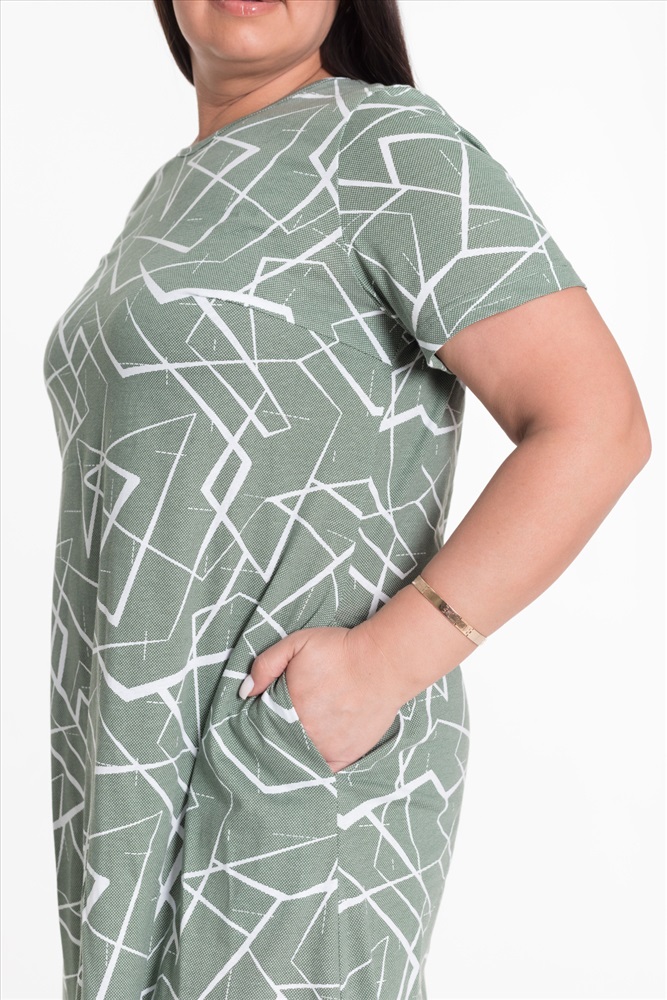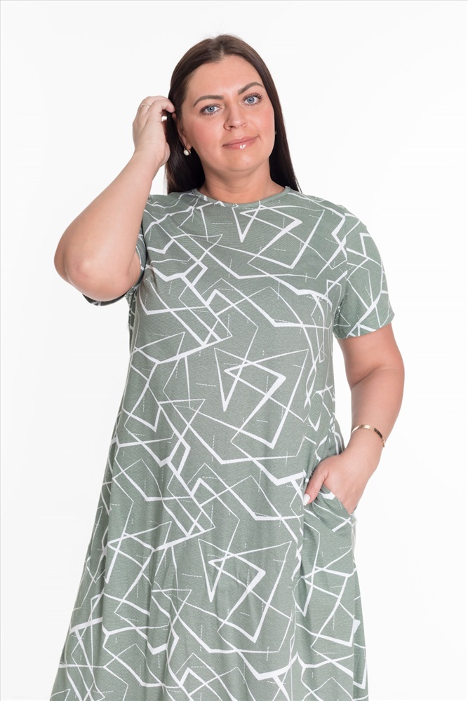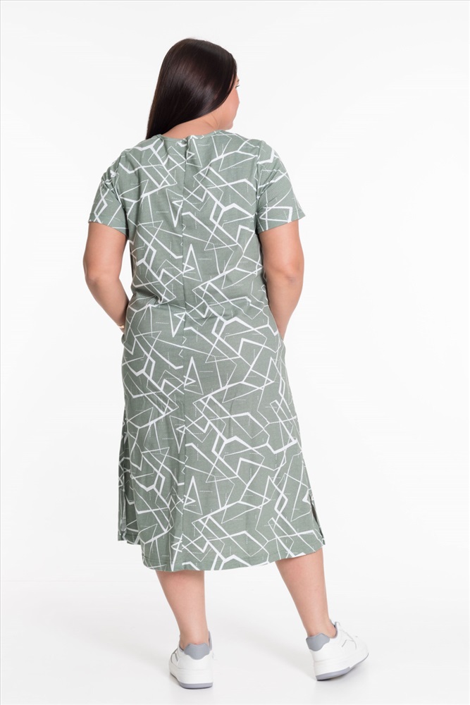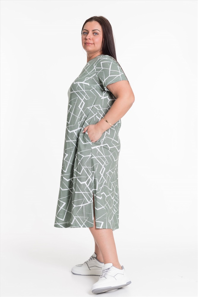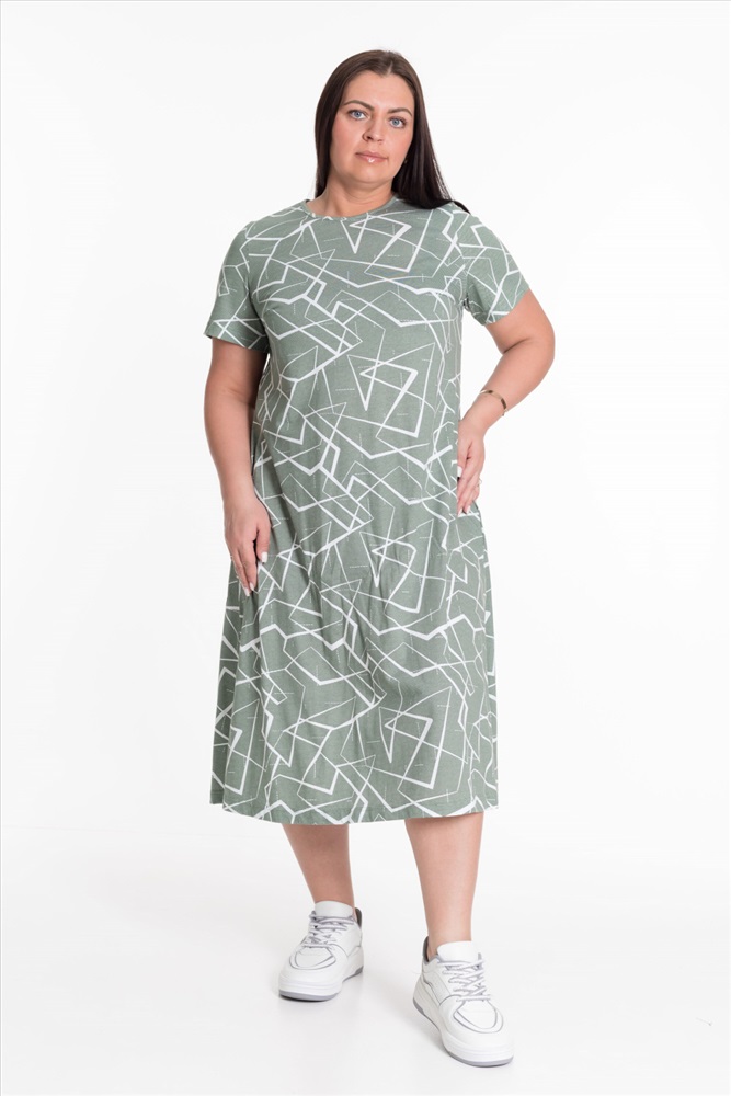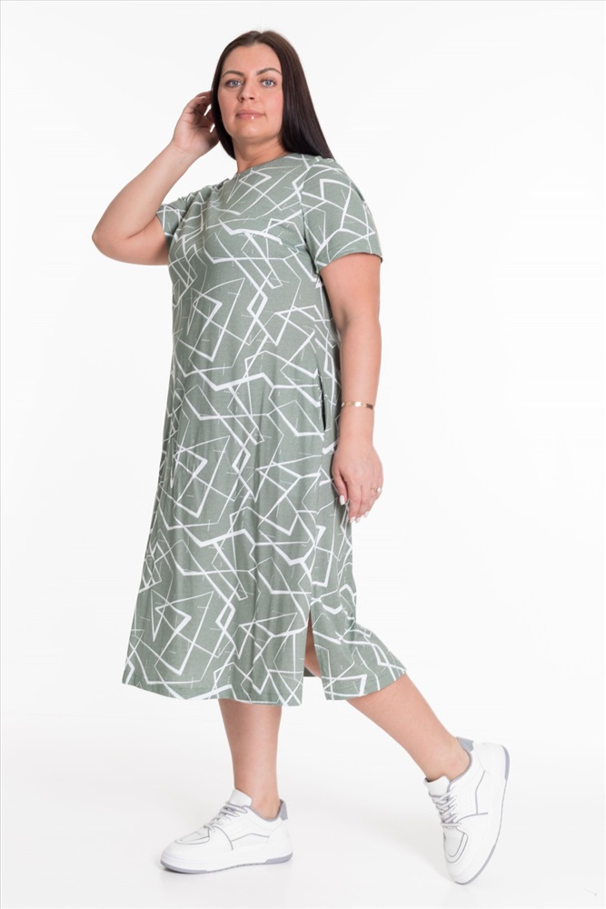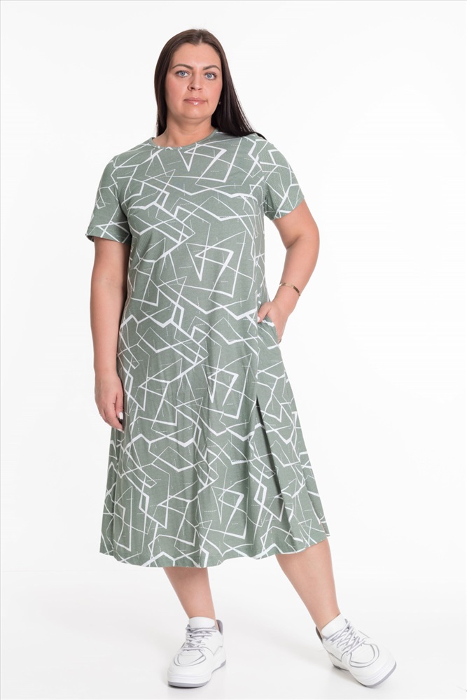 Тип длинны (для платьев): Миди Вид ткани: Кулирка Сезон: Летний Состав: Хлопок 100% Цвет Номенклатуры: хаки Платье из х/б полотна. По бокам разрезы, карманы в боковых швах, горловина обработана бейкой из основного полотна. Размерный ряд: 50-68 Комментарии к товару